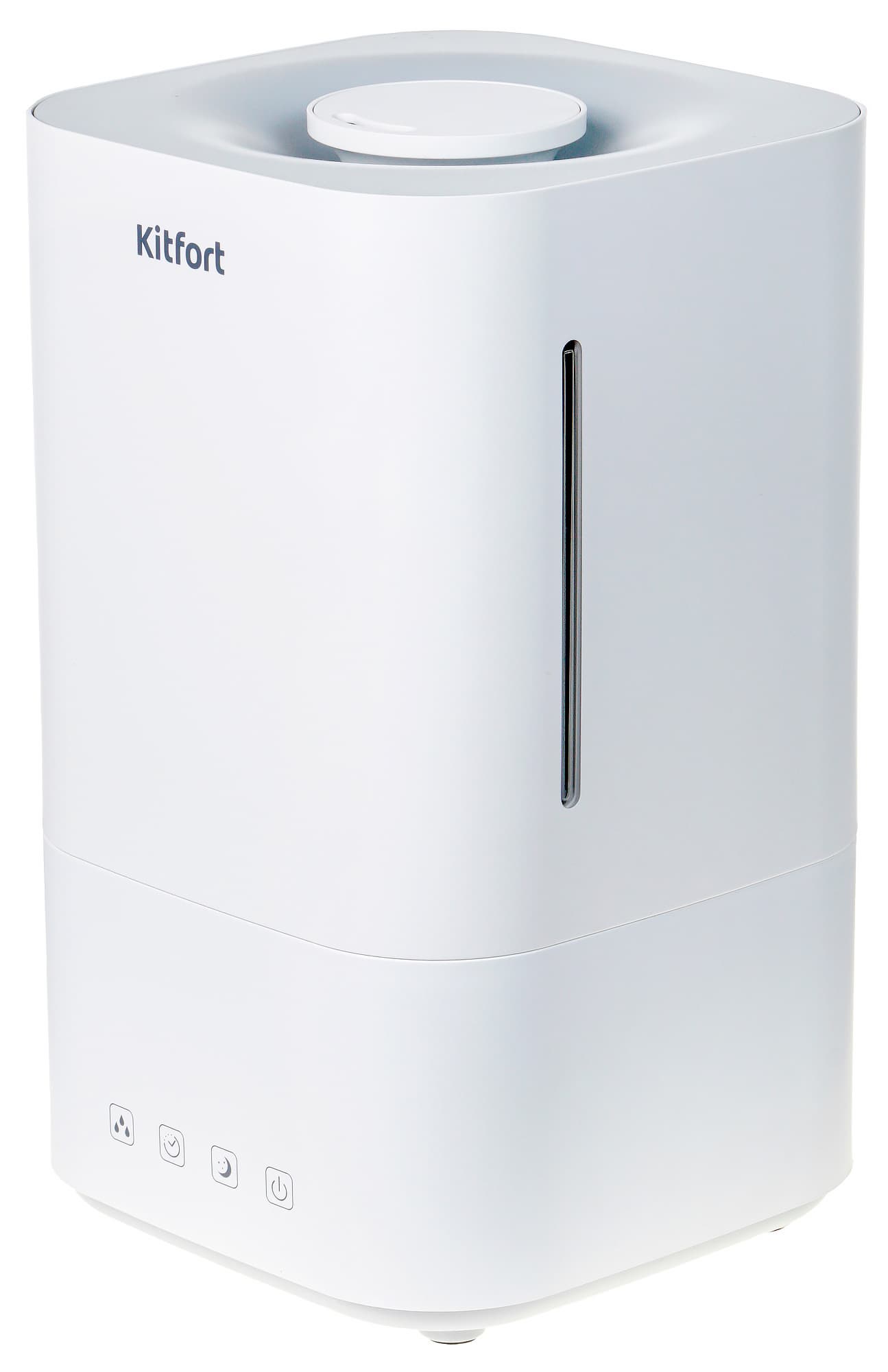 Дизайн устройства минималистичен. Увлажнитель Kitfort KT-2810 представляет собой параллелепипед со скругленными углами, выполненный из белого пластика. В верхней части его лицевой стороны размещен логотип производителя, по нижнему краю — четыре сенсорных кнопки. Над ними находится светодиодный дисплей, показания которого видны только во включенном состоянии — в выключенном он неотличим от поверхности корпуса.