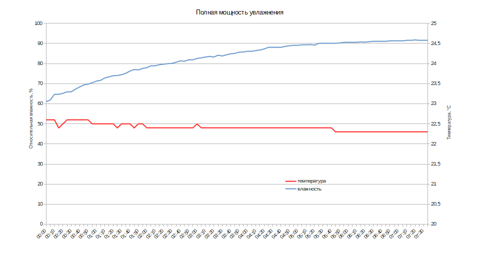 Мы включили прибор на максимальный уровень увлажнения в ночное время, когда температура воздуха оставалась более или менее стабильной и оставили его на семь с половиной часов.