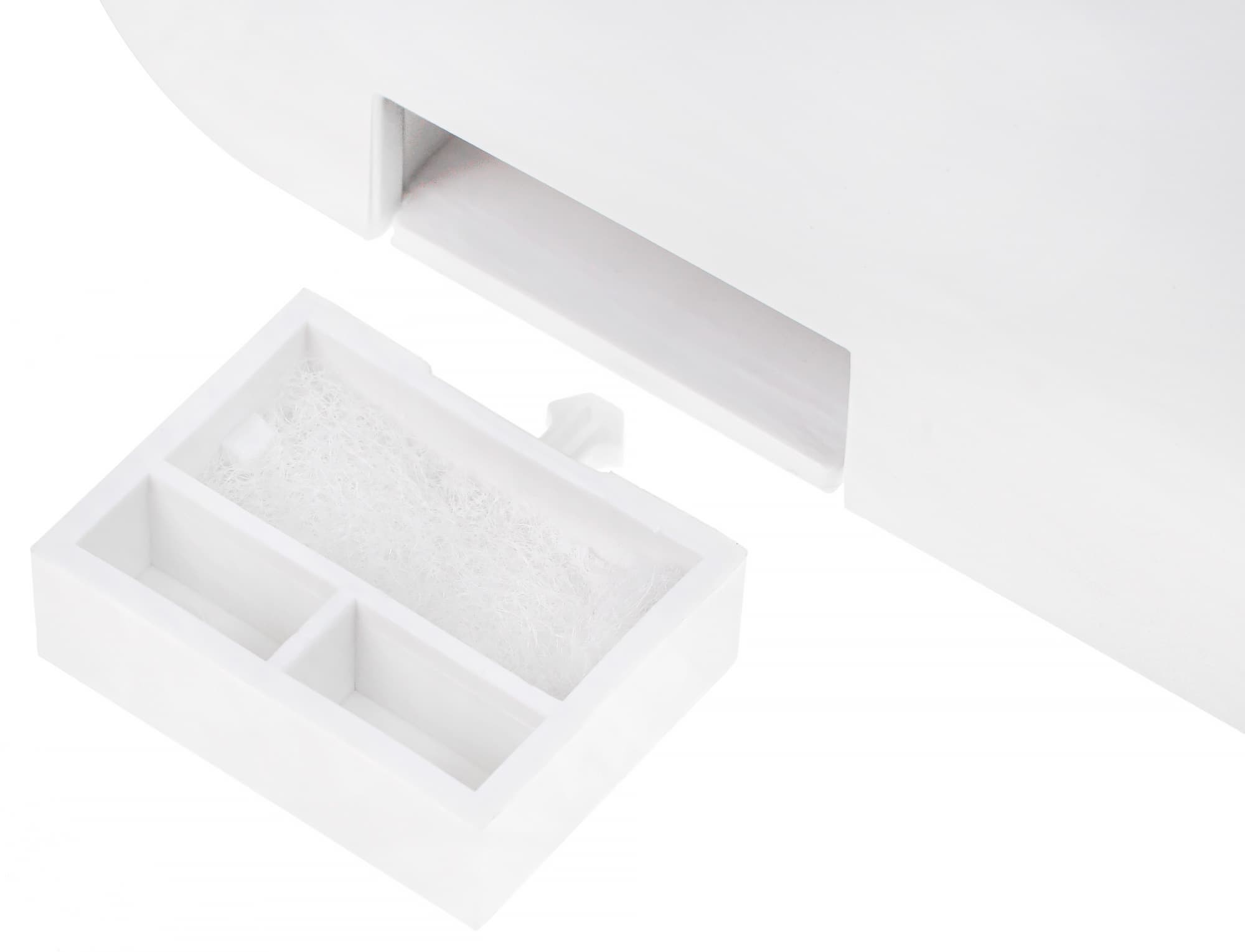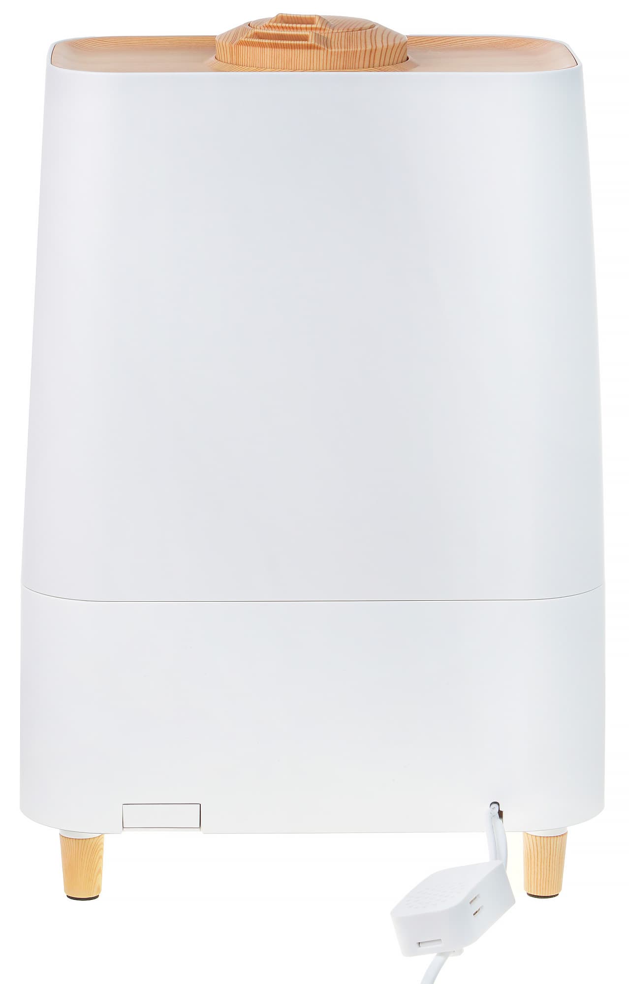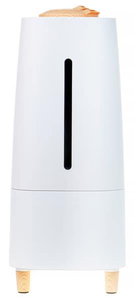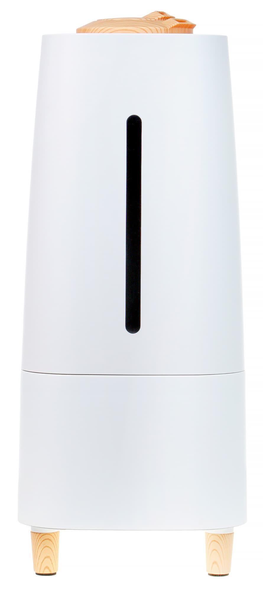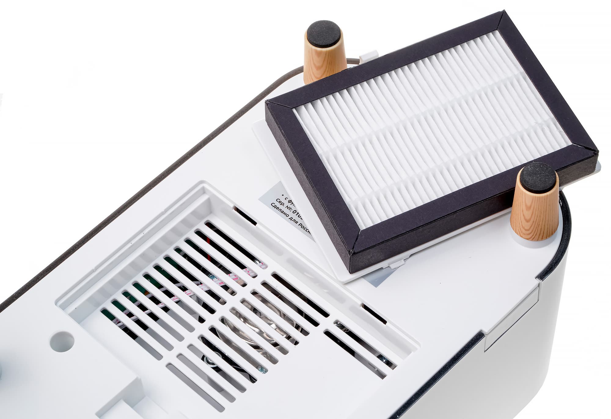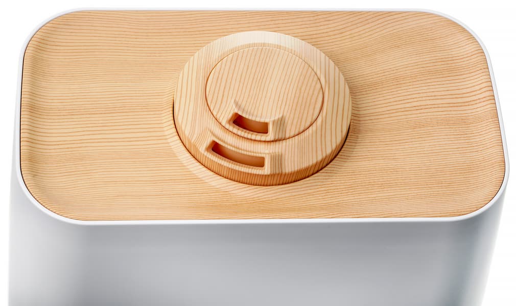 Отдельной похвалы заслуживают все элементы процесса наполнения резервуара: его форма и широкое отверстие, два поворотных сопла и съемная крышка, встроенный фильтр и складная ручка для переноски. Ароматизация работает, хотя и едва уловимо, но мы изучили матчасть и решили, что так полезнее для здоровья. Наконец, наши эстетические запросы были удовлетворены сочетанием матового белого цвета и вставок с имитацией дерева. Придраться не к чему, разве что магнитик не достался.