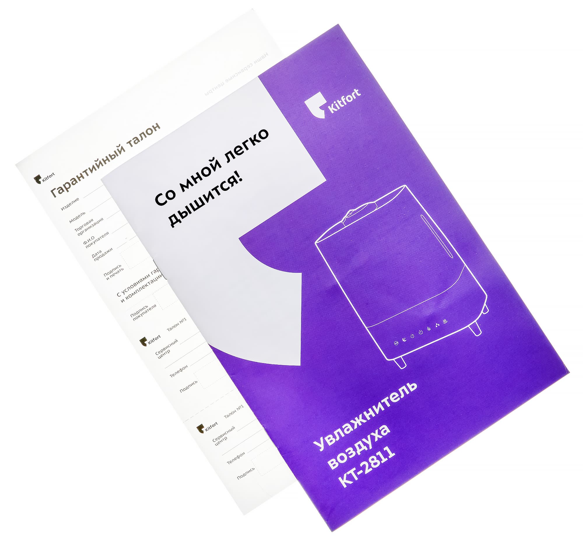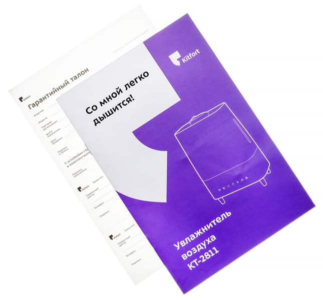 Классика Kitfort: брошюра из белой бумаги формата А5, где на 19 страницах рассказана вся необходимая информация. Целых две страницы текста отданы под описание роли оптимальной влажности воздуха для здоровья человека, порядке измерений и расчете оптимальных значений. Из схемы прибора мы узнали о местонахождении HEPA-фильтра (внизу корпуса), далее познакомились с порядком эксплуатации прибора, использованием функции ароматизации, оценкой времени для увлажнения помещения, мерами безопасности, техническими характеристиками и возможными неполадками.