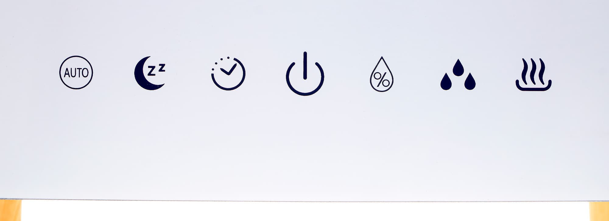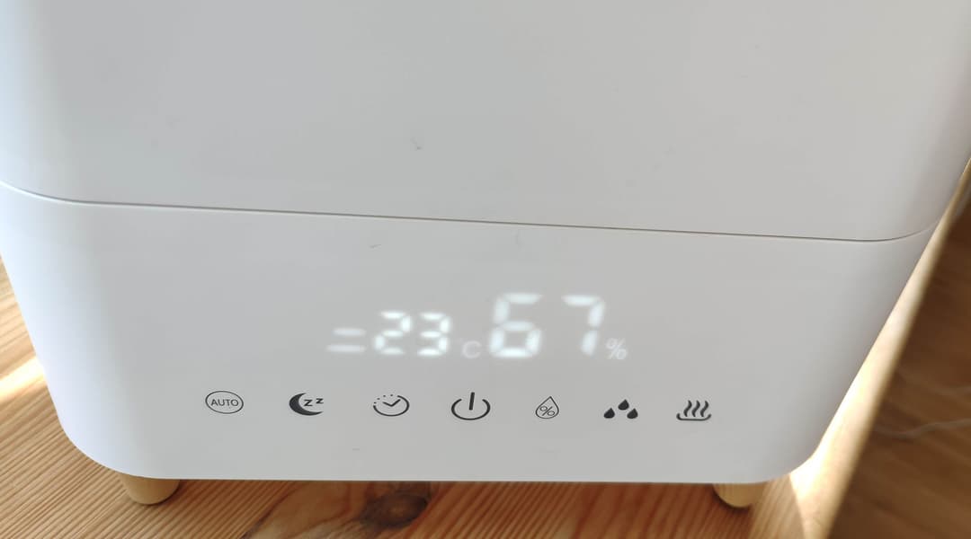 Все настройки выполняются циклическими нажатиями на сенсорные кнопки: например, при выборе мощности пара на дисплее будут высвечиваться одна/две/три полоски, затем снова одна. Для других функций параметры также задаются по кругу. Автоматический режим отталкивается от показаний гигрометра и включает необходимые программы самостоятельно исходя из текущей температуры, поддерживая в помещении относительную влажность от 55% до 68%. Кнопка с символом полумесяца включает ночной режим, то есть, отключает подсветку панели управления. Следующая кнопка запускает таймер выключения от 1 до 12 часов — весьма полезная функция, так как однажды мы забыли про прибор на 3 часа и получили влажность порядка 86% в помещении 16 м².