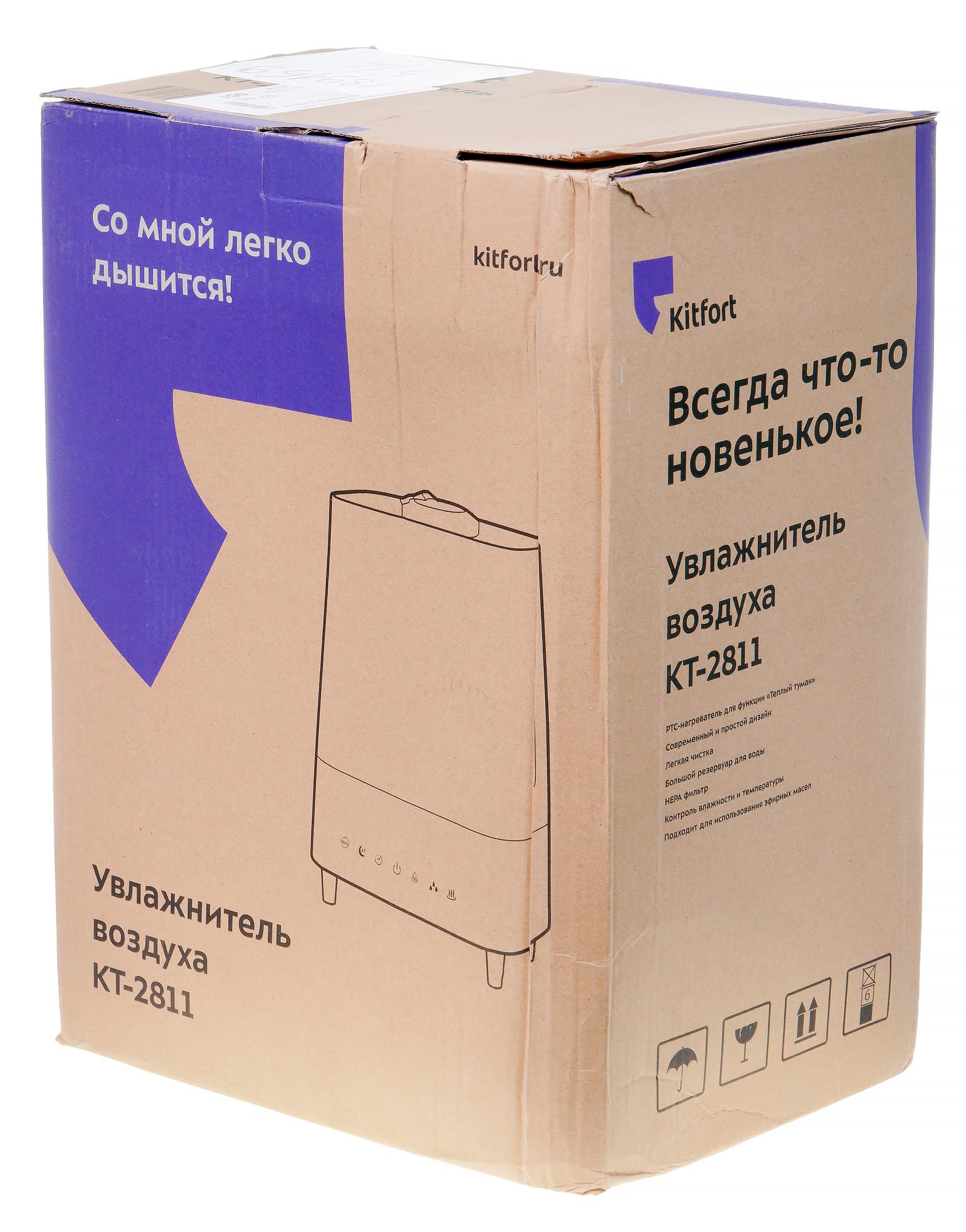 Новый стиль упаковки Kitfort — это бурый картон и ярко-фиолетовый принт со слоганом, выбранным специально для данного типа техники. Интересный прием, действительно, суть прибора доносится короткой фразой — в данном случае, «Со мной легко дышится». На передней и задней сторонах коробки нет обилия элементов: увлажнитель обрисован несколькими линиями, крупно указаны модель и производитель, а также адрес сайта. На боковых сторонах можно ознакомиться с техническими характеристиками прибора и ключевыми особенностями — в случае с KT-2811 они действительно впечатляют. У коробки нет ручки для переноски, что при небольших толщине и весе прибора не является проблемой, но почему-то в верхней части есть узкая прорезь, которая нас заинтриговала. На дне можно найти данные о производителе, сроках гарантии и службы техники.