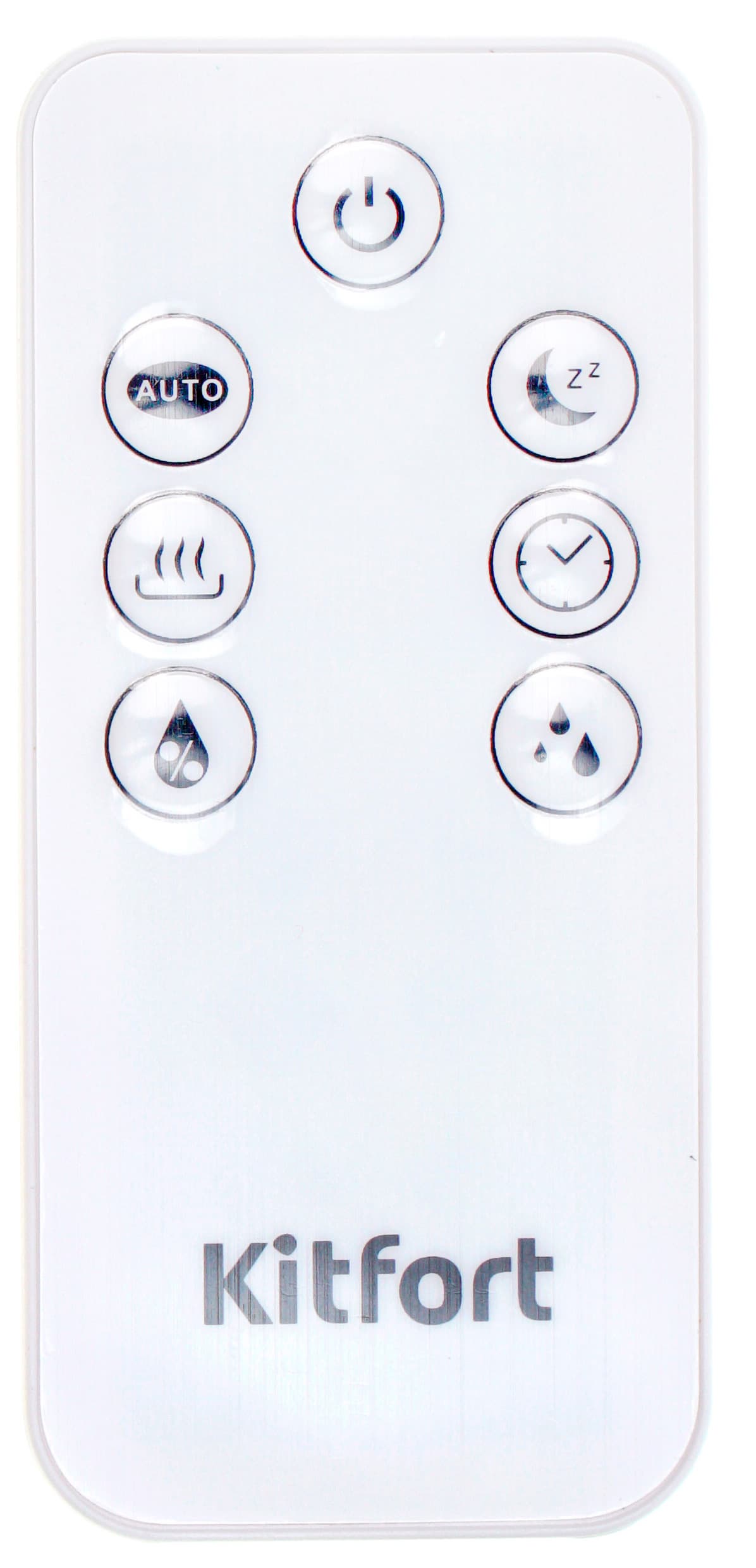 Кнопка справа от включения позволяет задать целевое значение влажности от 40% до 80% с шагом в 5%. Когда датчик гигрометра замерит желаемую влажность, прибор автоматически отключится и снова включится, когда она понизится более чем на 1%. Далее следует кнопка регулировки мощности подачи пара по шкале от 1 до 3, и наконец, кнопка включения РТС-нагревателя, который позволяет создать теплый пар. Вода нагревается до 50 °C, и такой пар быстрее повышает влажность в помещении, а также в процессе нагрева погибают некоторые бактерии и микроорганизмы (Kitfort не приводит подробности).