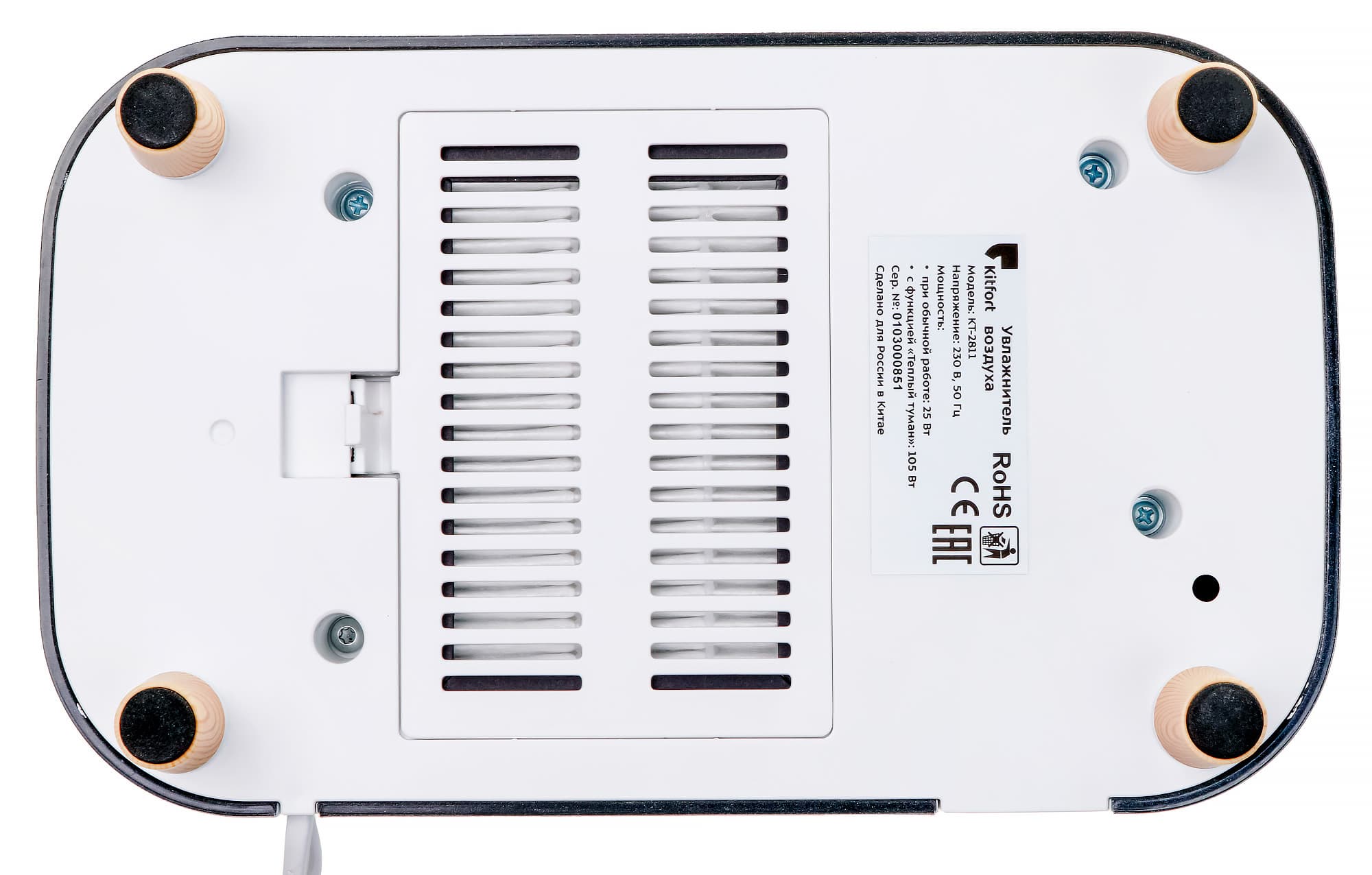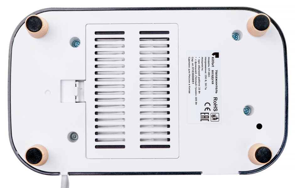 Технический запах после распаковки отсутствовал начисто. Перед началом работы мы сполоснули резервуар и протерли корпус чуть влажной тканью. Добавление ножек вниз корпуса прибора остается на усмотрение покупателя, но позволяет приподнять увлажнитель чуть выше над полом или другой поверхностью. Мы и так ни разу не наблюдали осадка мелких капель в процессе тестирования (исключая внештатную ситуацию с зашкаливающей влажностью из-за забытого таймера), но Kitfort советует размещать прибор на расстоянии 50—100 см от пола, чтобы равномерно увлажнить воздух в помещении. Это может быть журнальный столик или широкий подоконник (мы выбрали второе), а также провели тест с теплым паром на максимальном режиме в положении на полу. KT-2811 прошел его успешно — спустя час работы никакого конденсата на паркете не наблюдалось.