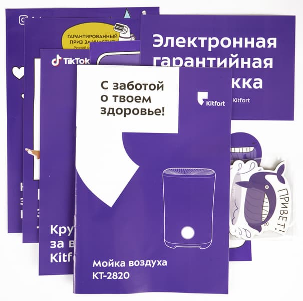 Прибор поставляется в картонной коробке c привычным для потребителя техники Kitfort дизайном: коричневый картон, схематическое изображение устройства и непременный слоган на лицевой стороне — свой для каждого класса бытовой техники производителя. Для климатического оборудования это безыскусный лозунг «С заботой о твоем здоровье!»