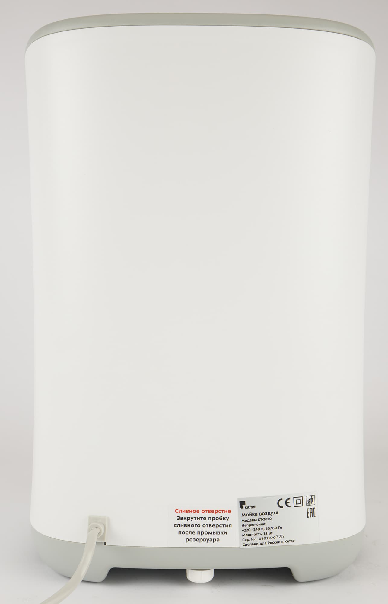 Электрический провод выходит из нижней части задней стенки. Здесь же есть шильдик с краткими техническими характеристиками и серийным номером. В самом низу — пробка слива и наклейка, напоминающая о необходимости закрывать отверстие после обслуживания.