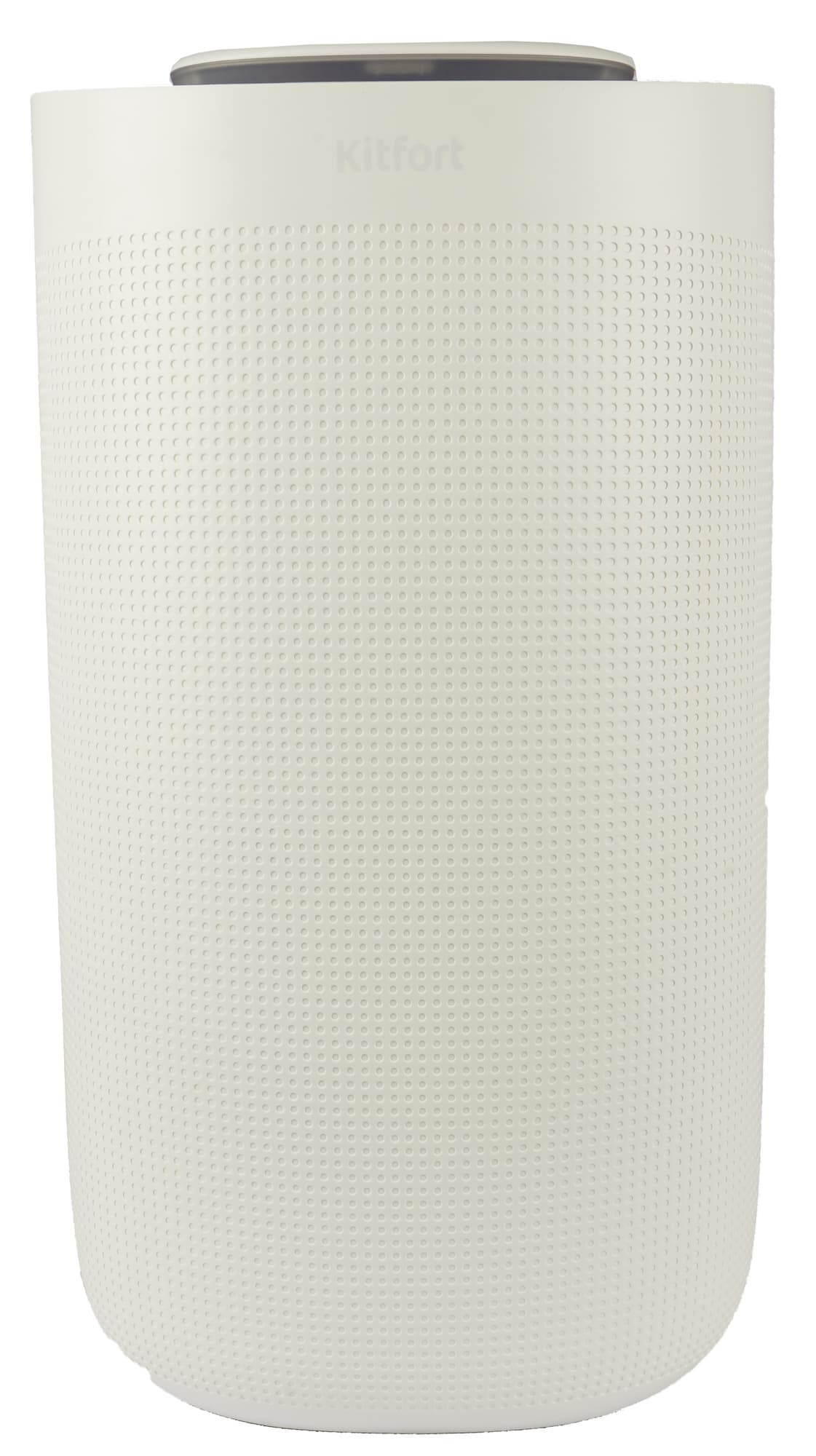 Kitfort KT-2843 представляет собой почти правильный цилиндр белого цвета, украшенный рисунком из множества мелких точек. В верхней части передней стороны еле заметен светло-серый логотип компании-производителя.
