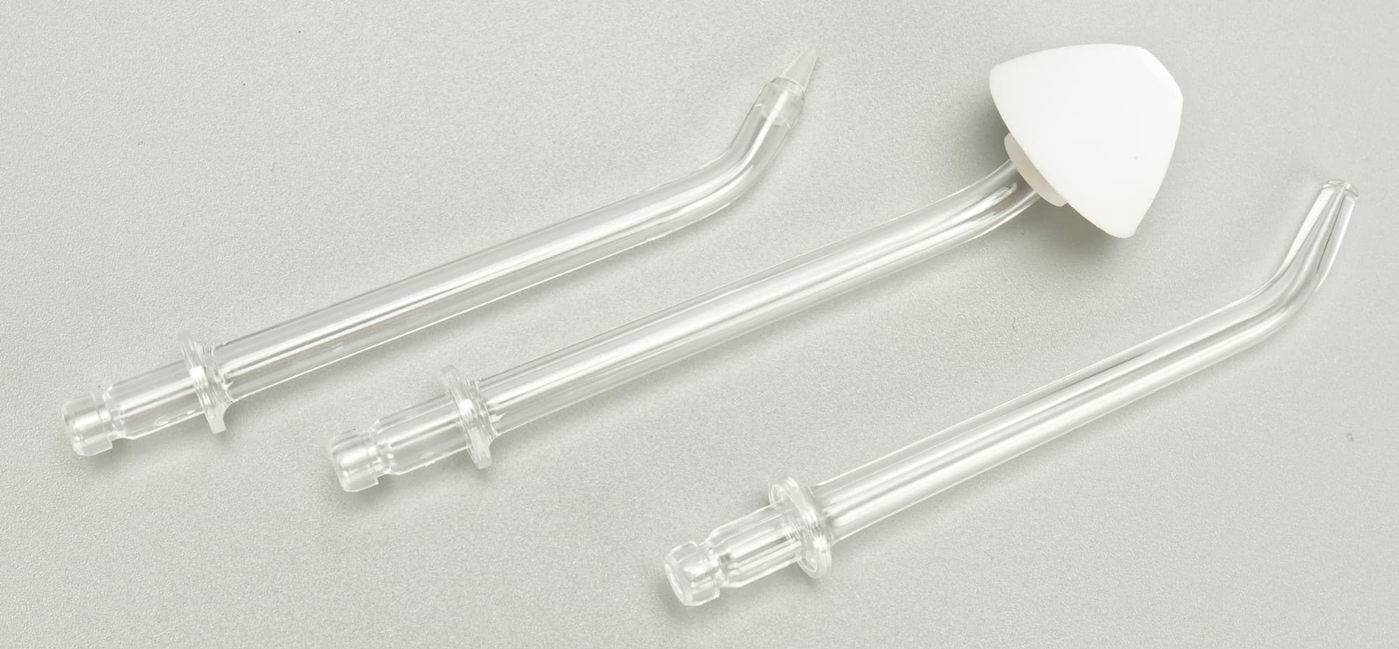 Насадок у Kitfort КТ-2945 по сути две: классическая струйная и вторая, с тонким силиконовым кончиком с узким отверстием, предназначенная для удаления зубного камня и налета. Напомним, выбор насадки тоже лучше уточнить у врача. Третья насадка — назальная. Все они индивидуальные, в наборе по одной на каждый вид. Соответственно, для использования одним человеком.