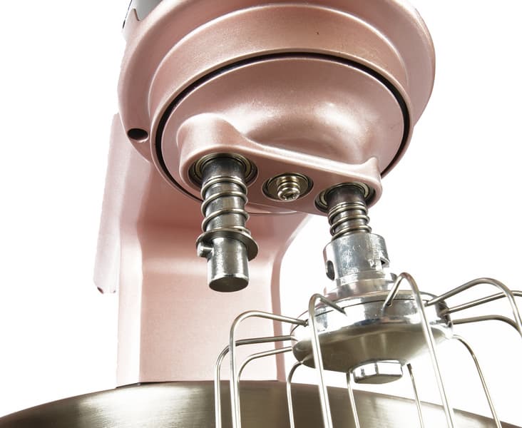 В комплекте к миксеру идут четыре полностью металлические насадки — венчик для взбивания, два крюка для замеса тугого теста (большой и маленький) и насадка для смешивания. Форма насадок традиционна.