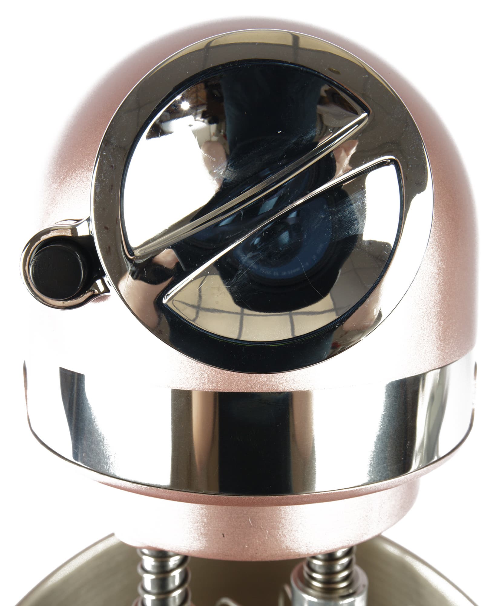 Подготовка к работе выглядит следующим образом. Нажав на кнопку разблокировки и удерживая ее, откидную часть необходимо поднять рукой вверх, затем отпустить кнопку — моторный блок зафиксирован. Теперь можно установить и закрепить в гнезде чашу и надеть насадку на любую ось шпинделя. Если планируется замес густого теста, то задействуются оба шпинделя, так как в комплекте идут два крюка. В конце надавить на рычаг и вернуть (опустить) моторный блок в исходное положение. Подвижная часть миксера поднимается и опускается только руками, что, кстати, нравится нам гораздо больше, чем если бы она резко откидывалась самостоятельно.