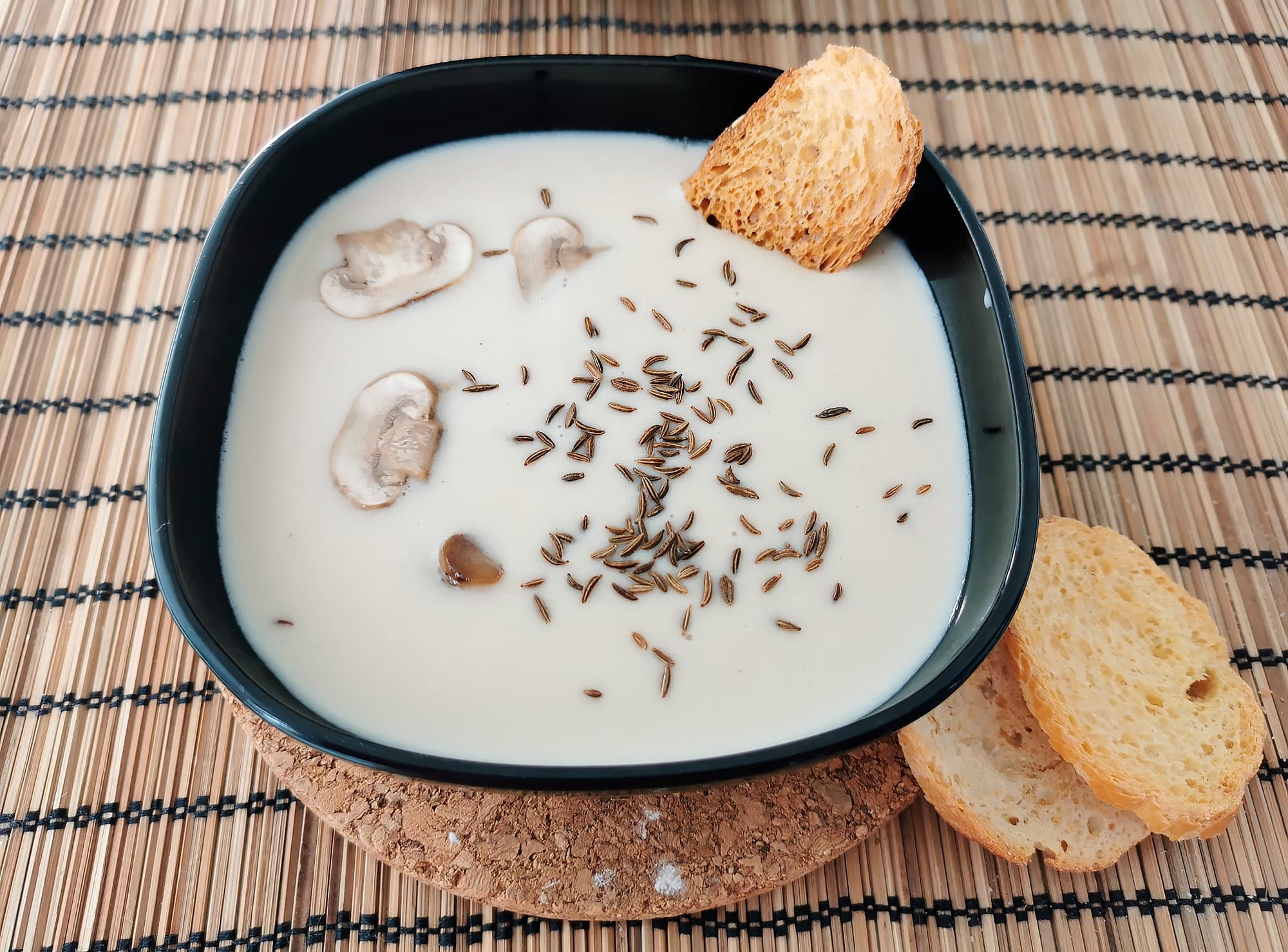 Для подачи на стол мы отдельно поджарили несколько грибов, положили их сверху на супчик, посыпали его тмином, а также приготовили к нему хрустящие гренки.
