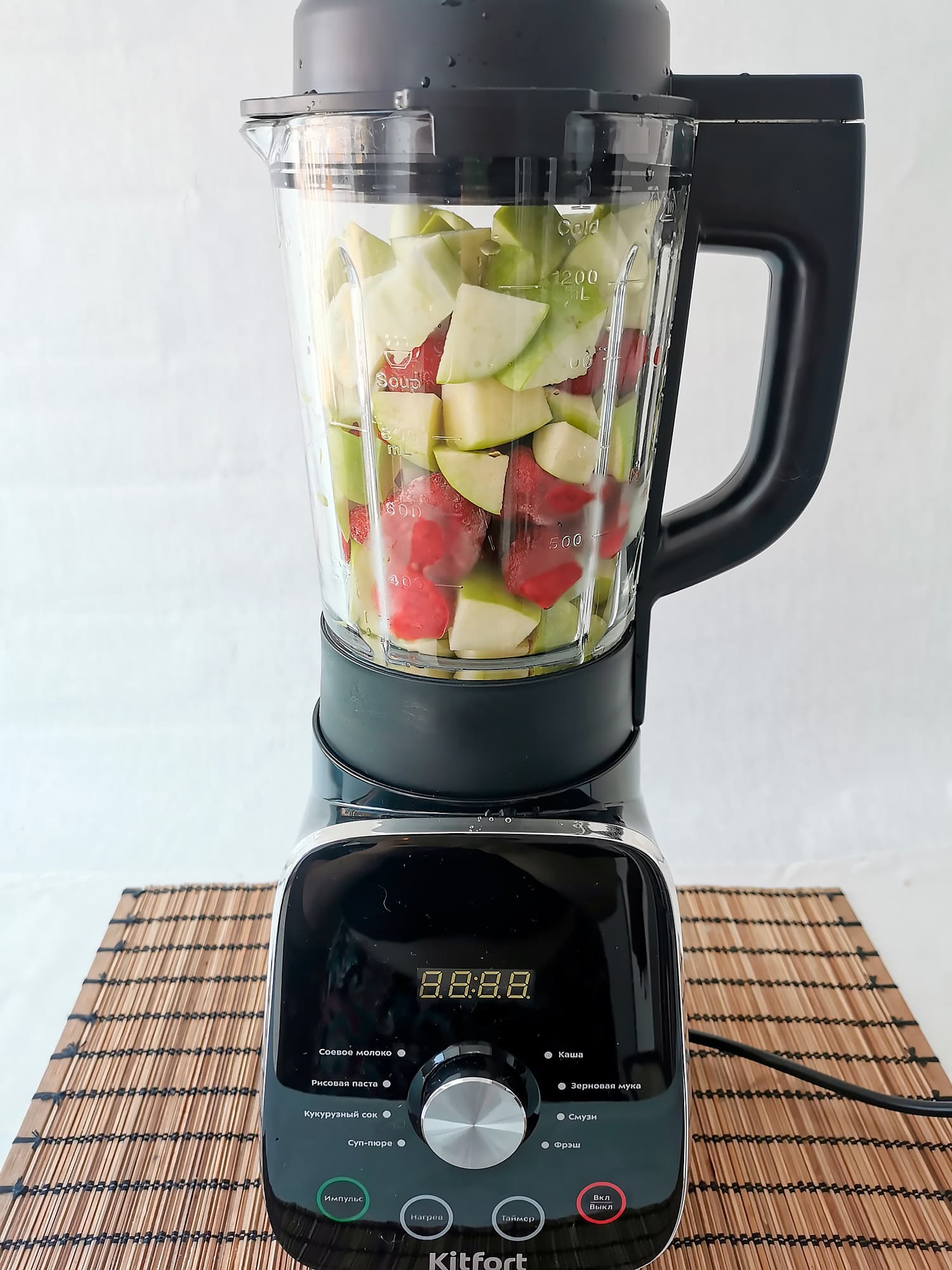 Для начала мы нарезали яблоки на небольшие кусочки и закинули их вместе с замороженной клубникой до верхней отметки чаши. Используя импульсный режим в течение 20 секунд мы получили прекрасную однородную смесь даже без добавления воды.
