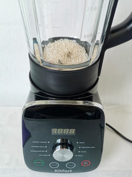 Мы вымыли и насухо вытерли блендер, после чего взяли 50 г краснодарского риса, как указано в инструкции (заодно проверили совпадают ли измерения граммы/колпачки в заводских рецептах; они совпали — получается ровно 2 мерных колпачка) и поместили рис в чашу.