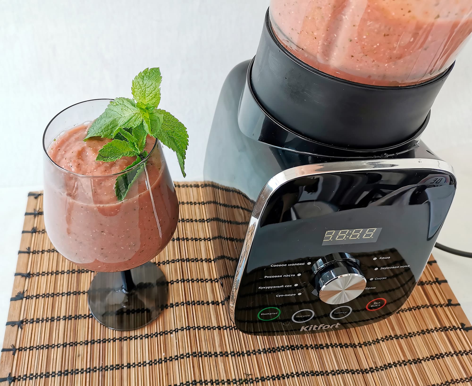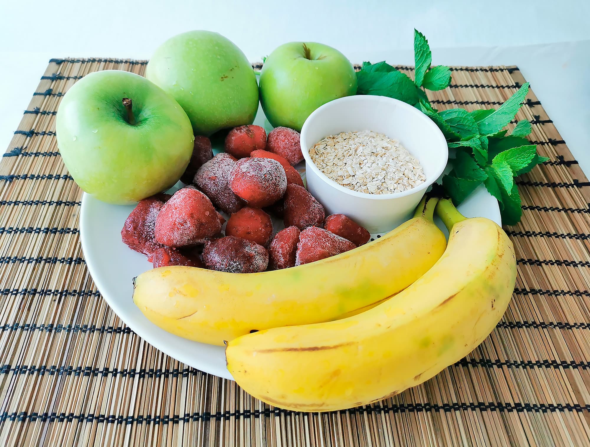В связи с невыносимой жарой нам очень захотелось не только провести еще один важный тест на способности блендера, но и немного освежиться, поэтому мы придумали такой рецепт смузи: зеленые сладкие и кислые яблоки, замороженная клубника, мята, банан и немного овсяных хлопьев.