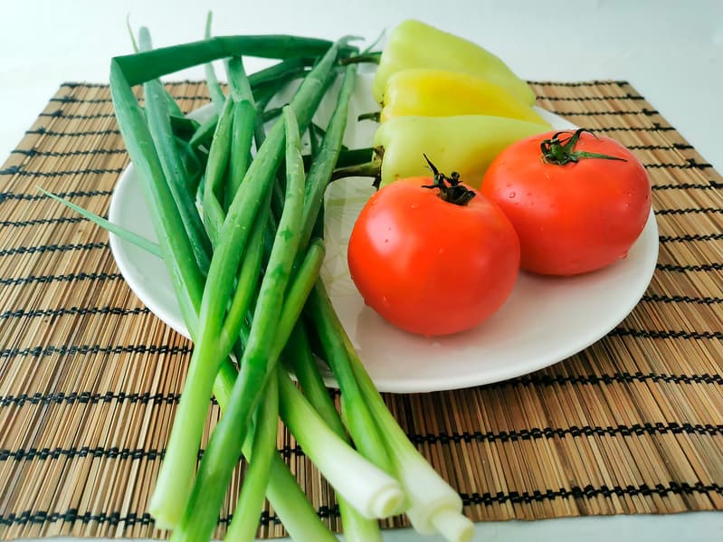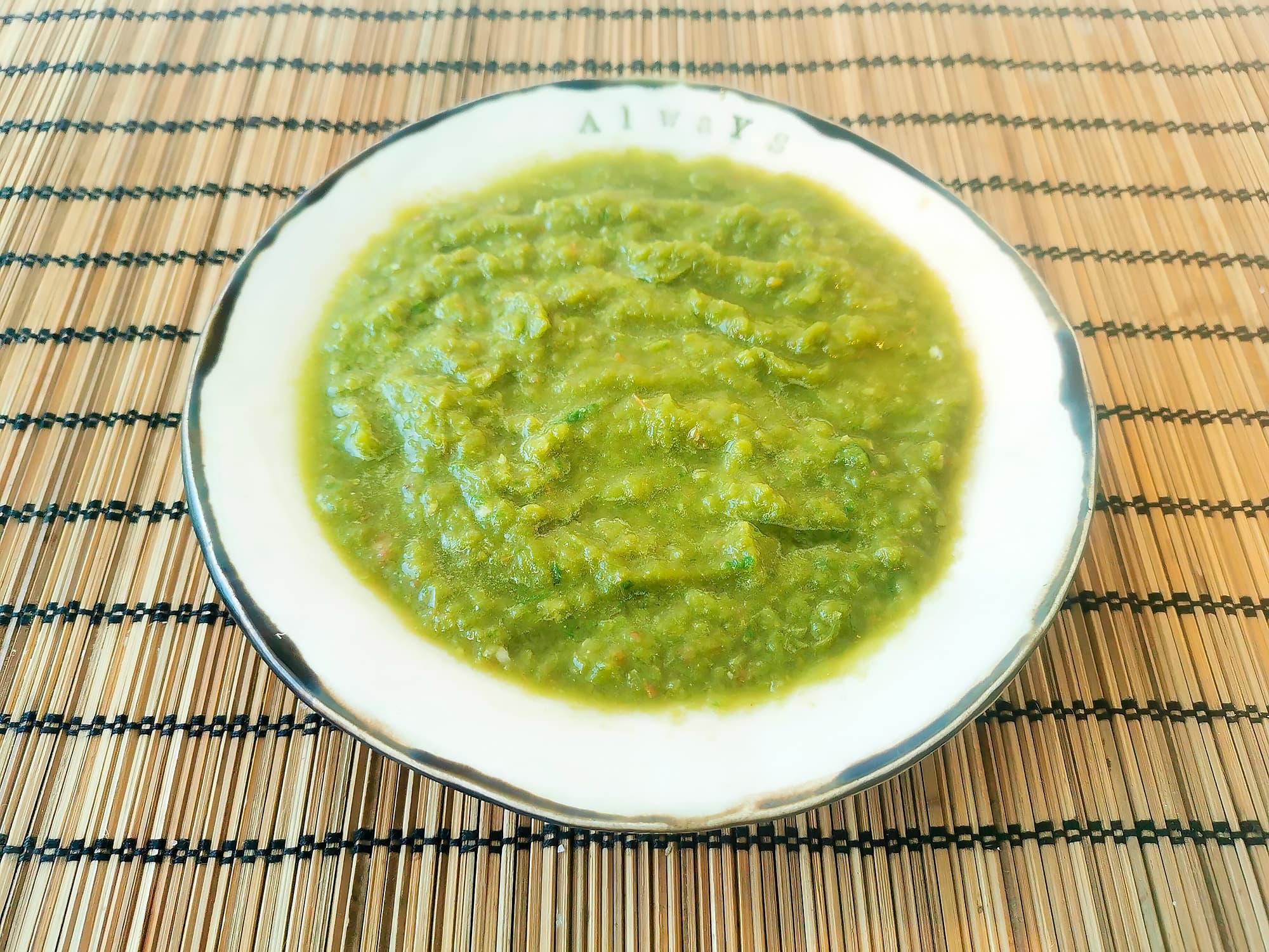 Нам захотелось попробовать приготовить что-то свежее, пикантное и при этом с использованием томатной массы, оставшейся после первого тестирования. Интернет нам предложил интересный вариант свежей аджики из томатов, молодого зеленого лука, болгарского перца (мы взяли грунтовой), соли и оливкового масла. В конце нам захотелось немного отклониться от рецепта и подкинуть еще пару зубчиков чеснока.