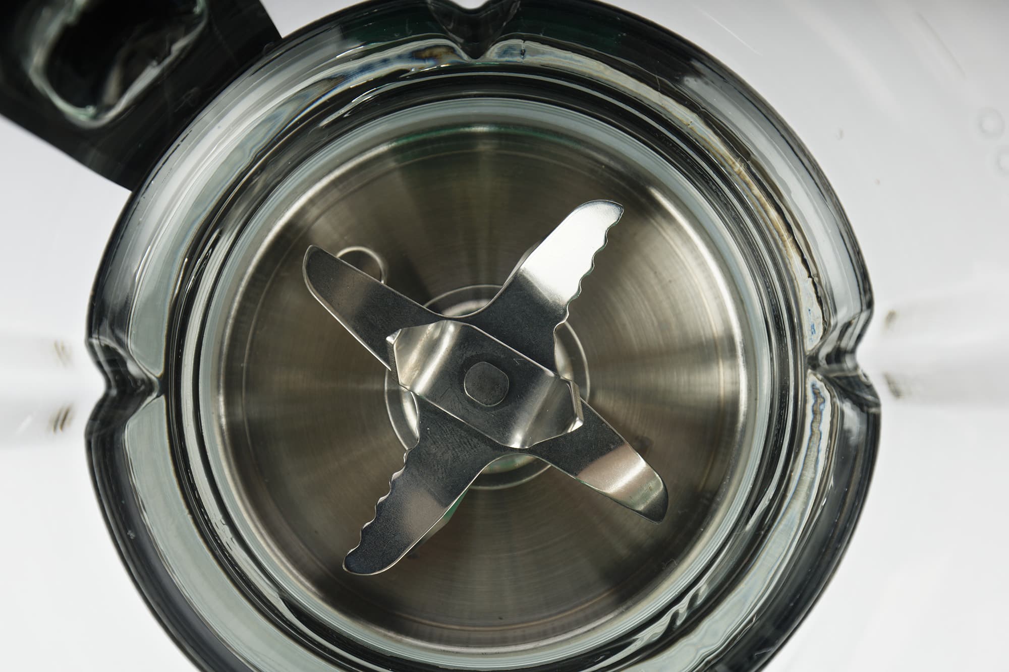 Заглянув внутрь чаши, мы рассмотрели ножевой блок. Он состоит из восьми лезвий, расположенных на трех уровнях. На нижнем находятся два лезвия, направленные вниз, на среднем — четыре, ориентированные перпендикулярно чаше, два из которых имеют небольшой изгиб и серрейторную (пилообразную) заточку, на верхнем два небольших острия, загнутые вверх. Ножи небольшие, но выглядят прочными.