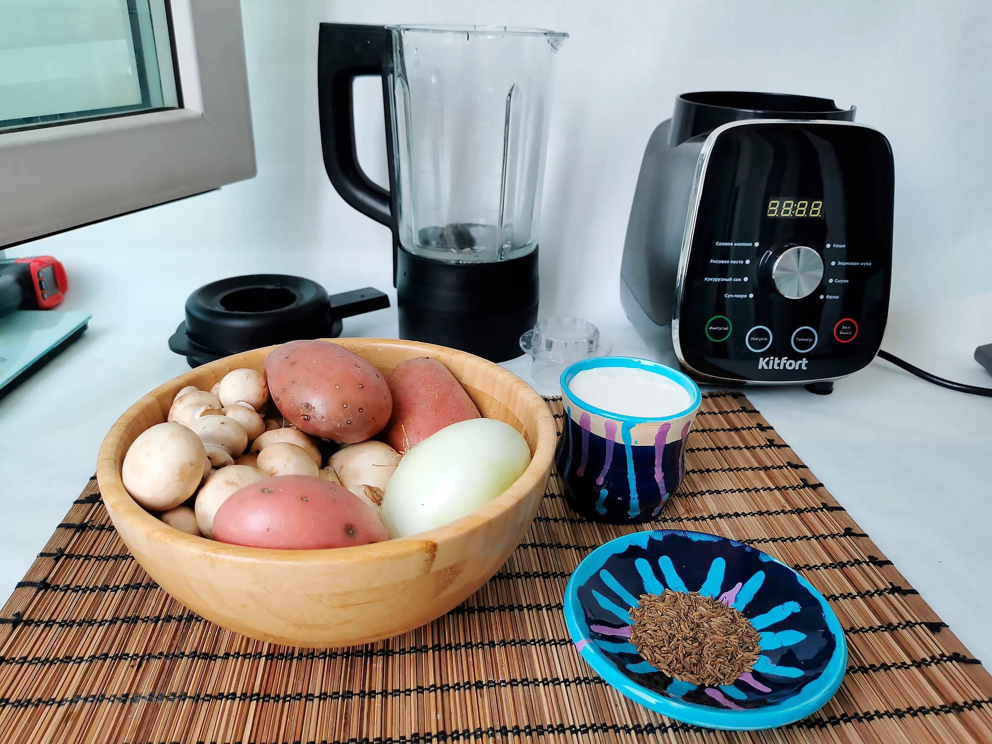 Для того чтобы проверить основную отличительную возможность нашего блендера, мы решили приготовить любимый крем-суп из шампиньонов, картофеля, сливок и репчатого лука.