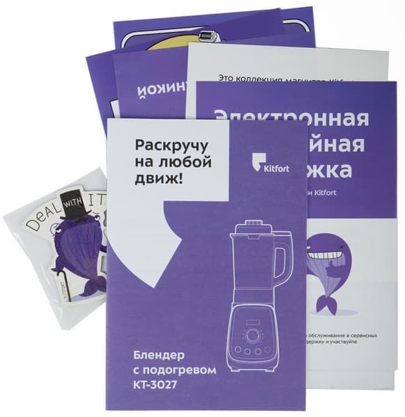 У блендера минималистичная, выполненная в трех цветах (черный, фиолетовый и белый) классическая упаковка бренда Kitfort. На фронтальных сторонах нарисованы очертания нашей модели, а также подписано ее наименование, по бокам можно найти краткую информацию о функционале и технических характеристиках. На дне производитель заботливо указал, что утилизировать прибор следует в специальных местах.
