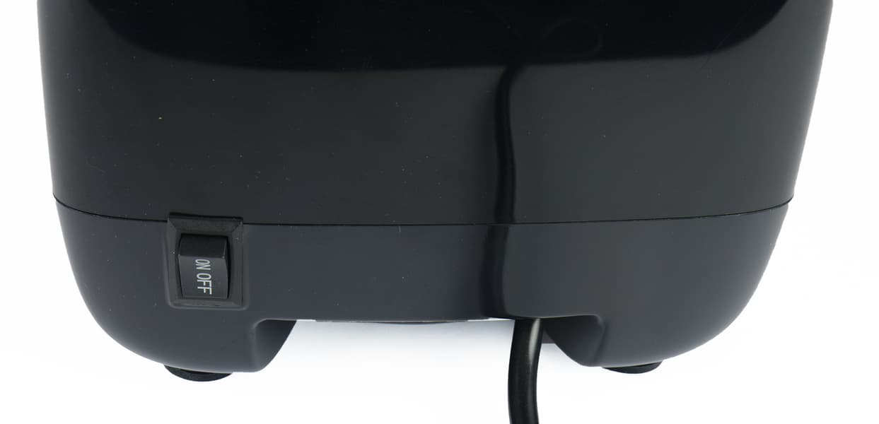 Шнур электропитания расположен сзади в самом низу рядом с одним из вентиляционных отверстий. Его длина вполне достаточна для небольшой кухни, однако в случае если розетка расположена далеко, он может оказаться коротковат. В случае если прибор будет располагаться вплотную к розетке, некоторая часть шнура поместится в небольшой отсек, находящийся на дне корпуса. Чуть выше на задней стороне расположен переключатель включения/выключения питания.