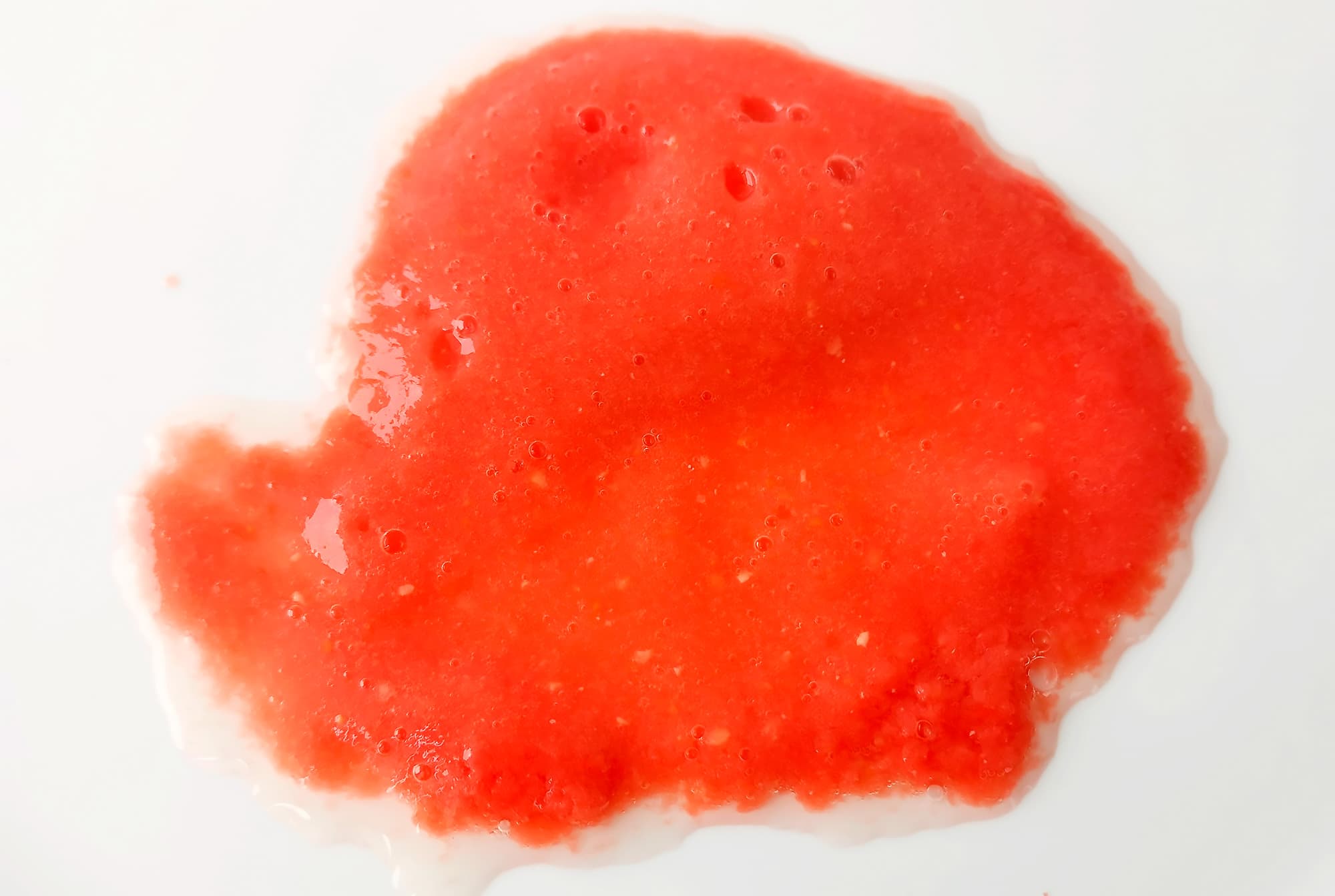 При детальном рассмотрении нежной, почти воздушной томатной массы на белом блюдце мы смогли все же заметить крохотные кусочки шкурки и семян, однако попробовав на вкус получившуюся гомогенную смесь, практически не смогли почувствовать этих микрочастиц во рту.