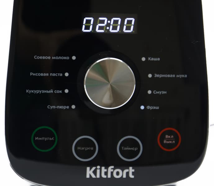На лицевой части моторного блока располагается маленький дисплей, под ним расположена круглая ручка переключения программ, по бокам от которой приведены их названия, рядом с каждой находится круглое окошко со светодиодным элементом. Некоторые из программ вызывают улыбку, т. к., вероятно, рассчитаны на жителей страны производителя: например, «Рисовая паста» или «Кукурузный сок» вряд ли будут часто подаваться на стол в вашем доме.