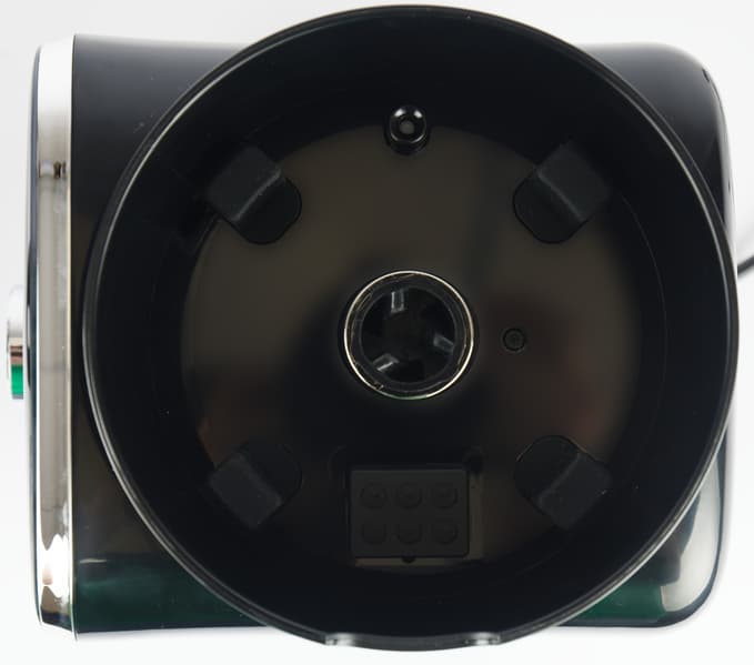 В процессе сборки мы выяснили, что чаша вставляется в моторный блок сверху и без закручивания, т. е. мы просто ее опускаем, и она плотно соединяется с основанием. В гнезде можно увидеть четыре резиновых уплотнителя, компенсирующих вибрацию чаши, разъем для ножей посередине и прорезиненный электрический разъем справа для подогревающих элементов чаши.