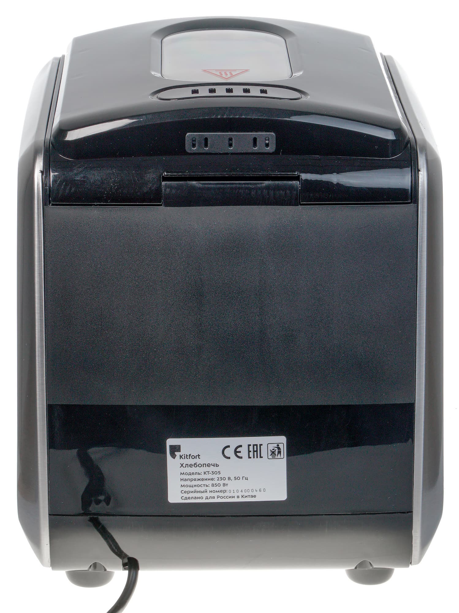 Шнур питания выходит из корпуса сзади, там же расположена табличка с серийным номером и техническими характеристиками прибора.