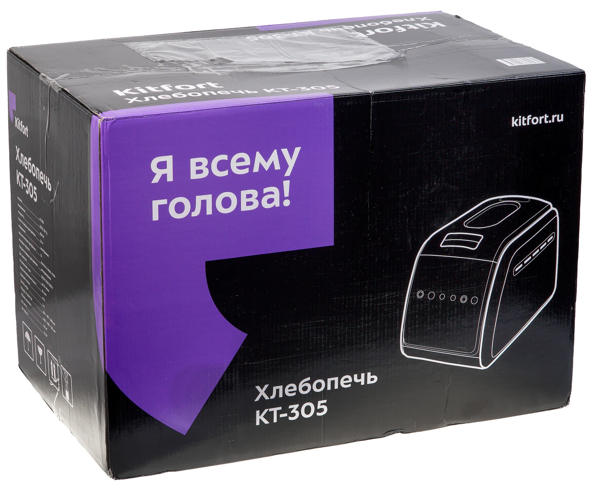 Хлебопечь прибыла на тестирование в картонной коробке стандартной расцветки Kitfort — черной с фиолетовым. На коробке — схематическое изображение прибора, его технические характеристики и, как обычно, креативные слоганы производителя. Устройство надежно упаковано и закреплено внутри пенопластовыми вставками.