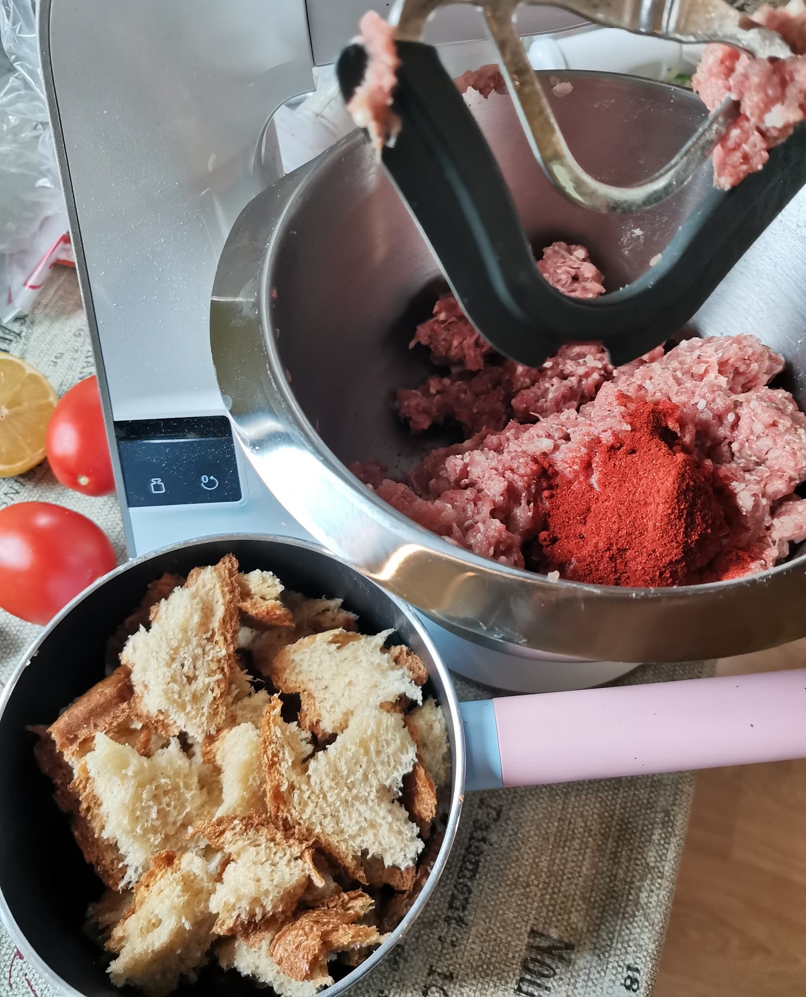Для мясного хлебца мы взяли фарш, немного хлеба, вымоченного в молоке, копченую паприку, соль.