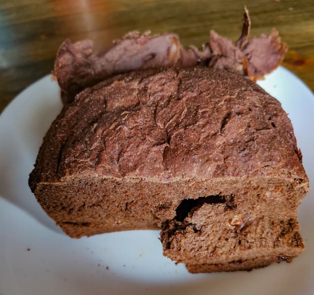 Мы взяли одну упаковку готовой смеси для бородинского хлеба весом 450 г. По рецепту на упаковке добавили воды и дрожжи, установили вес хлеба 1000 г, средняя корочка. Программу для выпечки 5, ржаной хлеб. Но поскольку смеси оказалось недостаточно, буханка сформировалась только вокруг одной лопатки, получилась маленькой, довольно плотной.