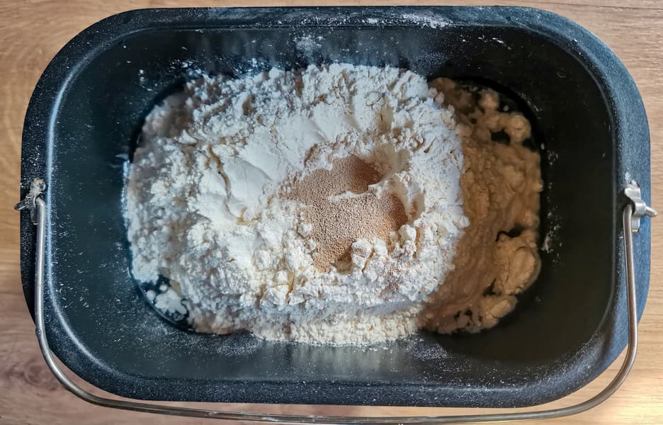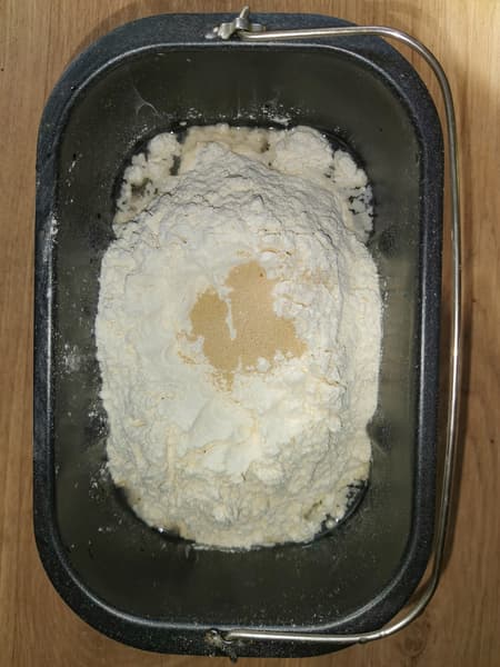 Рецепт классического хлеба мы взяли из инструкции к прибору. Все ингредиенты (вода, мука, дрожжи, соль, сахар, масло) положили в емкость хлебопечки, выставили программу 1, вес 1500, среднюю корочку.
