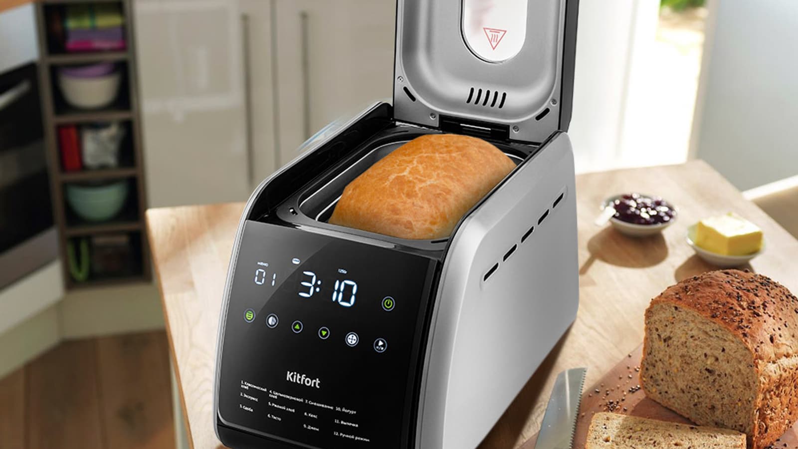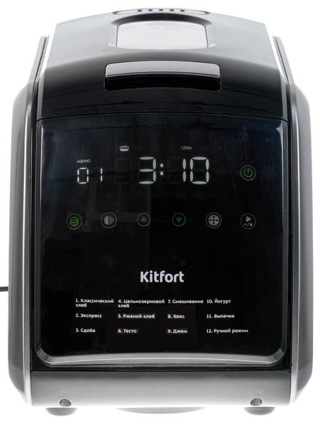 Хлебопечь Kitfort KT-305 нам понравилась. Для того чтобы сделать хлеб в домашних условиях, достаточно положить ингредиенты в емкость и задать нужную программу. Прибор сам сообщит, когда нужно добавить сухофрукты в сдобу, когда закончился процесс выпекания или часовой подогрев хлеба после выпечки.
