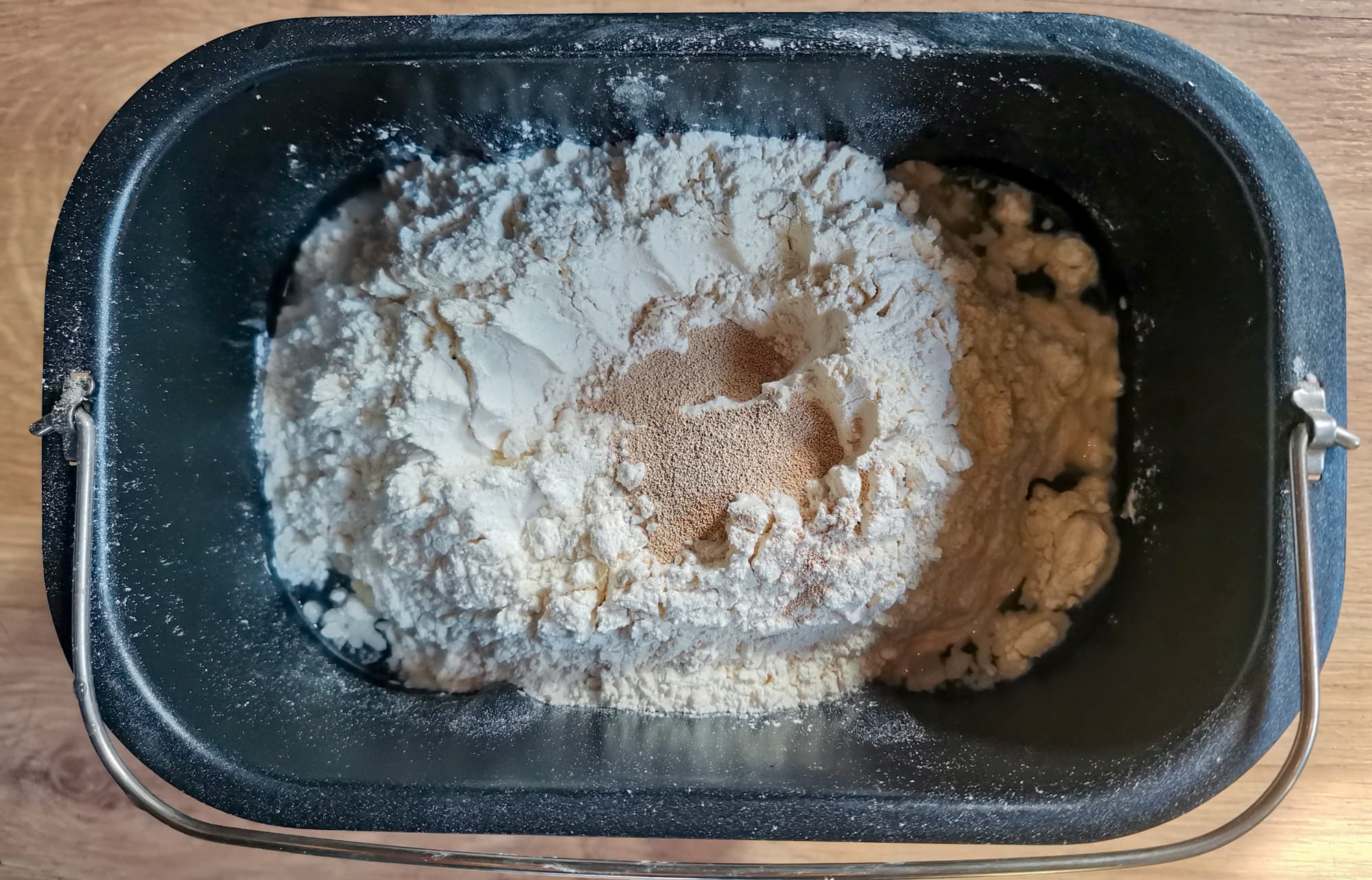 Мы взяли базовый рецепт классического хлеба из инструкции, но засыпали в емкость 650 г пшеничной муки в/с + 100 г солодовой ржаной муки. В остальном действовали как в предыдущем рецепте.