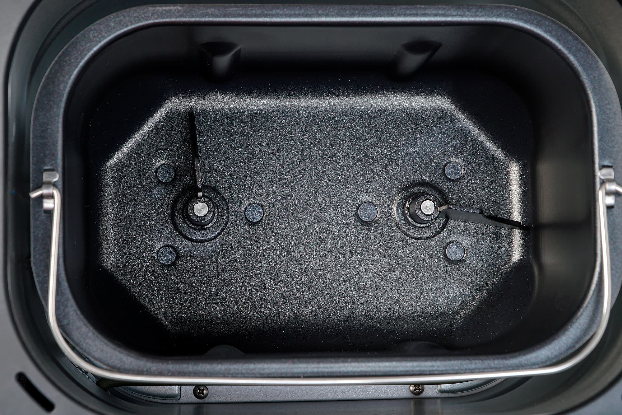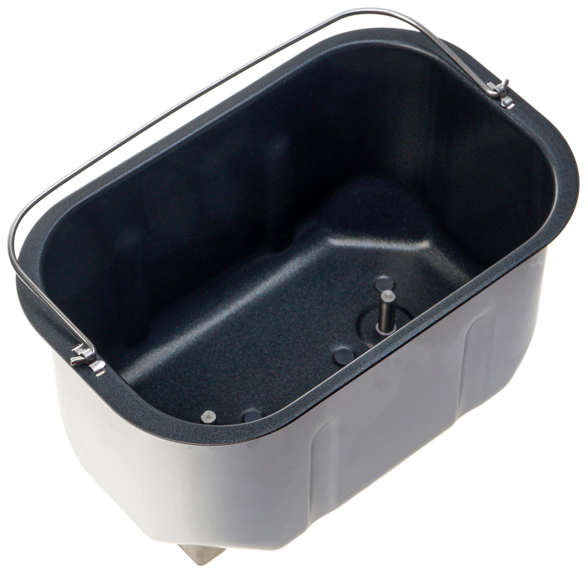 Внутрь корпуса вставляется емкость для выпечки объемом 3,5 л на специальной подставке для фиксации внутри корпуса, с неплохим антипригарным покрытием и металлической ручкой для переноски и вынимания. Металлические штыри на дне — это оси, на которые надеваются лопасти для перемешивания.