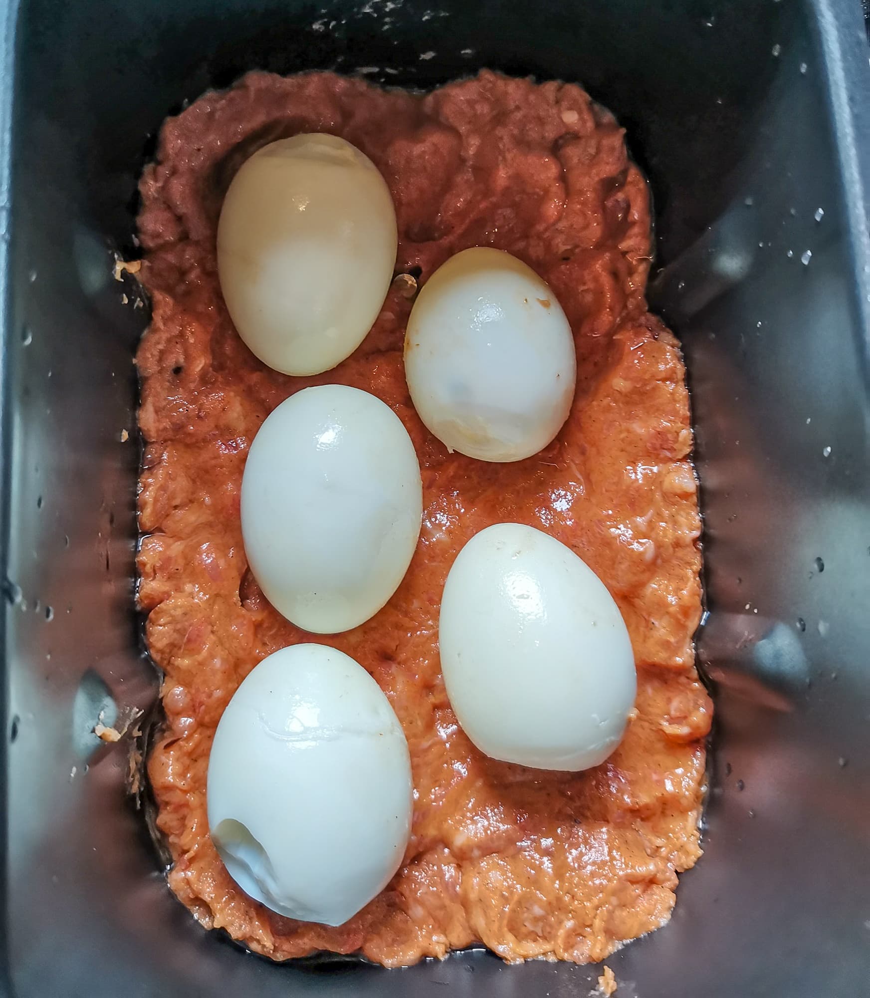 Половину смеси уложили в емкость хлебопечки, туда же положили вареные яйца и накрыли их оставшейся смесью.