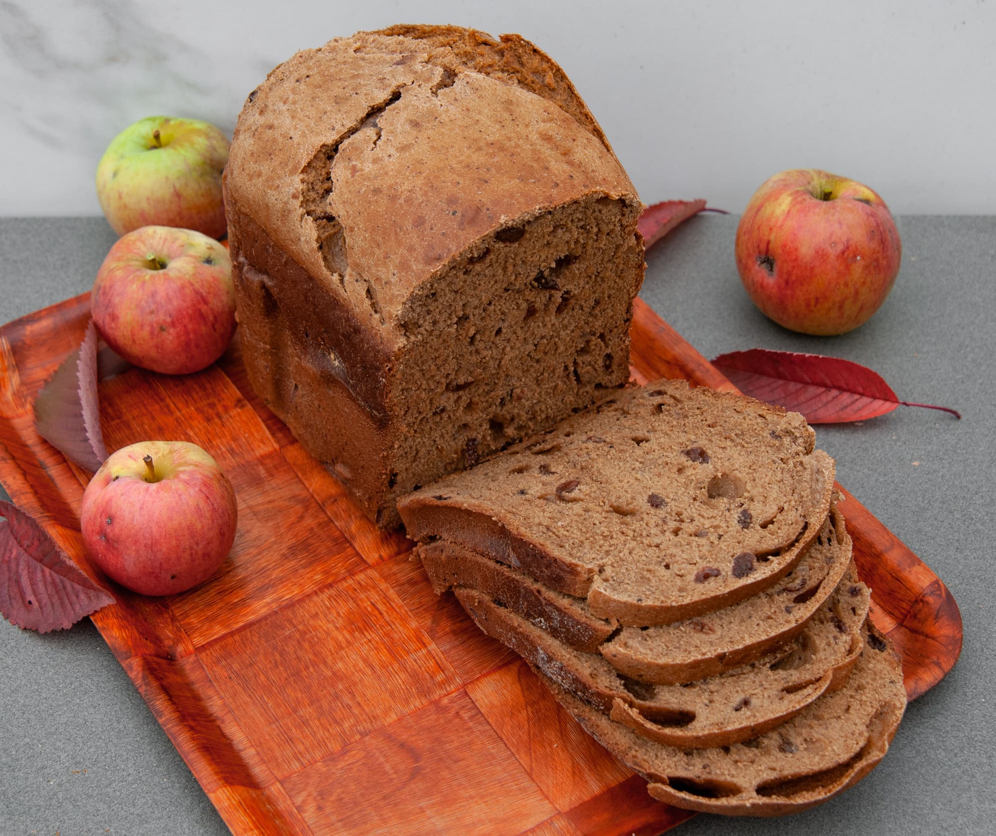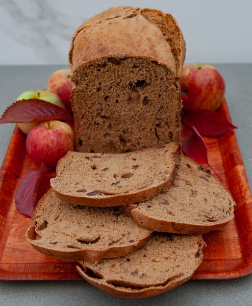 Для бриоши мы отдельно замесили тесто в тестомесе с большим количеством масла, специй и сахара. Делали 2 расстойки по несколько часов и только после этого загрузили тесто в емкость хлебопечки, добавили еще немного масла и выставили на режим 3, сдоба. После сигнала засыпали в тесто подсушенные яблоки. Вынули из хлебопечки после окончания программы.