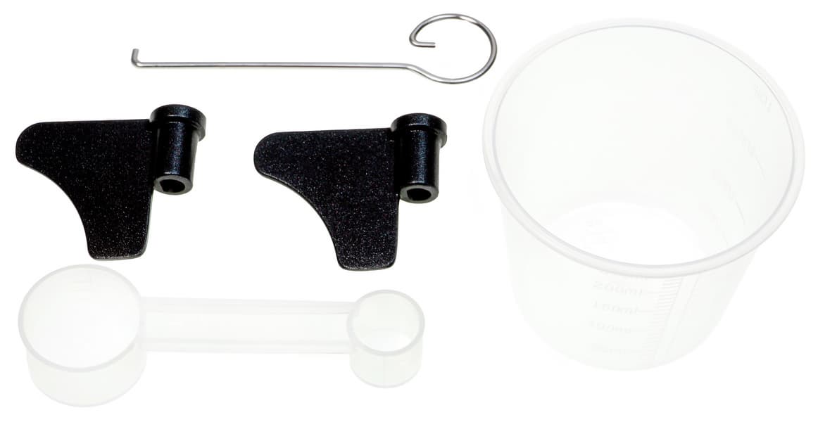 Лопасти — металлические с антипригарным покрытием. Для извлечения их из буханки, если они случайно снимутся с осей, в комплект входит специальная скрепка. В комплекте также мерный стакан.