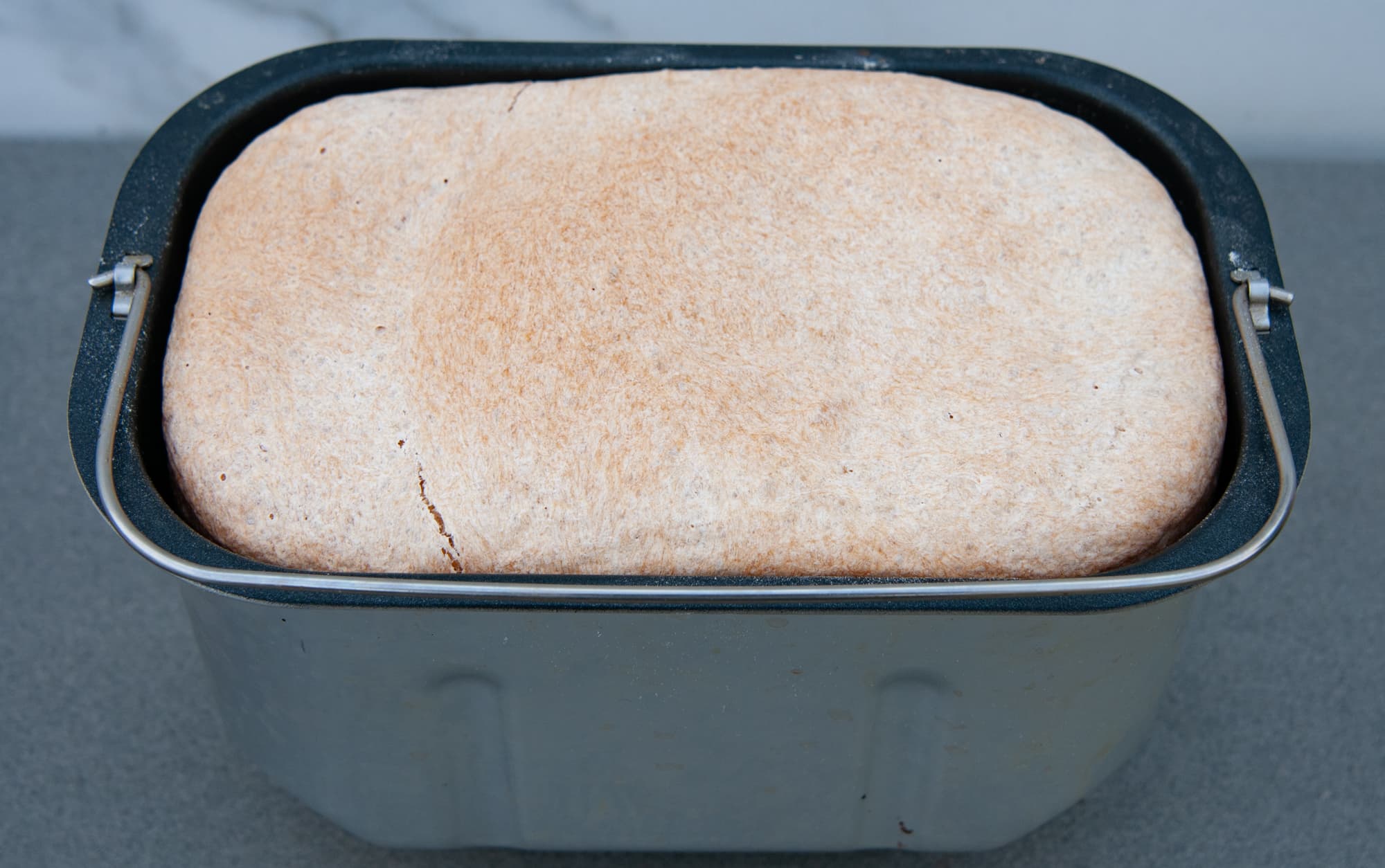 Через 3,5 часа достали емкость их с хлебом. Буханка получилась достаточно ровная, верх не провален внутрь, отделилась от емкости легко, лопатки остались на осях.