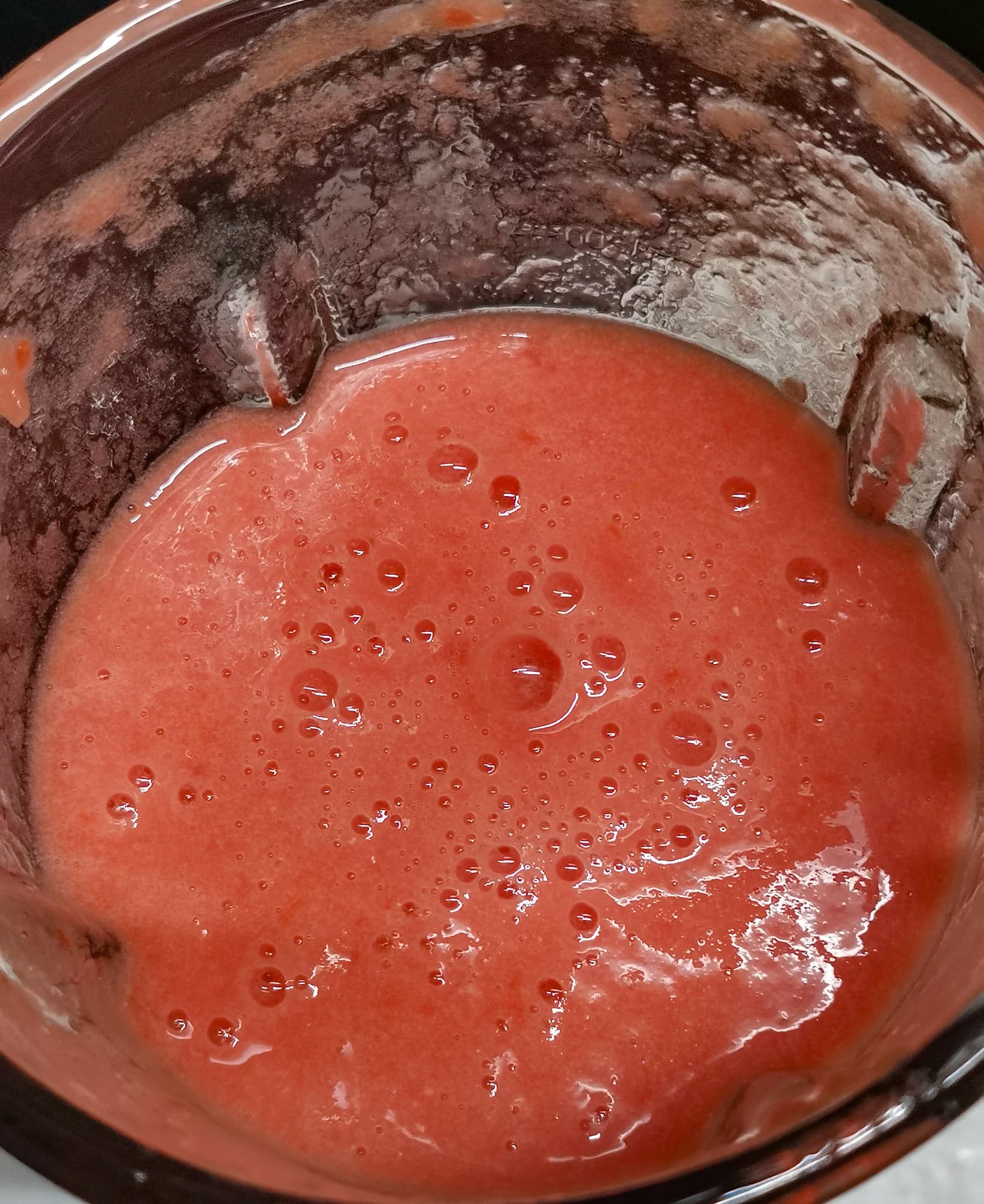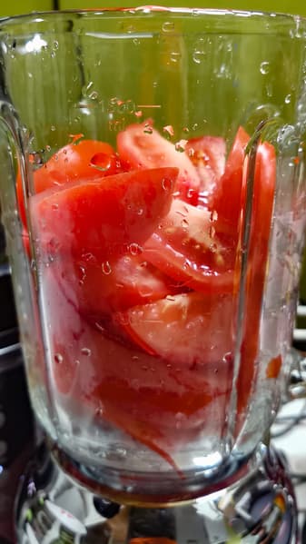 Загрузили бо́льшую часть томатов в чашу блендера, включили импульсный режим. Через пару включений помешали томаты, немного прижали их ко дну. Включили импульс на несколько секунд еще пару раз. После этого блендер смог подхватить кусочки и достаточно быстро их перемолол. Мы доложили оставшиеся кусочки и выставили максимальную третью скорость на 1 минуту.