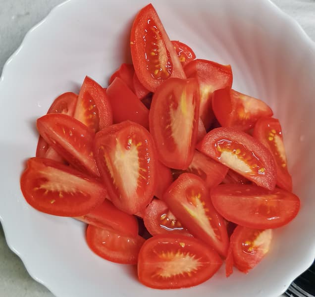 Для теста мы взяли 600 г томатов сорта сливки, разрезали их на четвертинки, вырезали плодоножки.