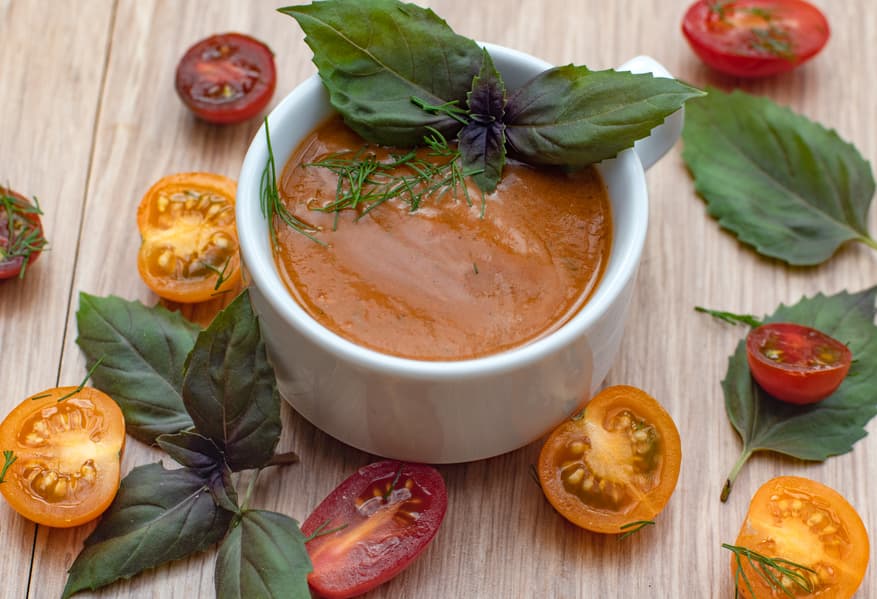 В томатный смузи мы добавили сухую копченую паприку, растительное масло, соль, чеснок и пряные травы. Блендировали смесь в течение еще 2 минут на высокой скорости и получили прекрасный, достаточно однородный соус.