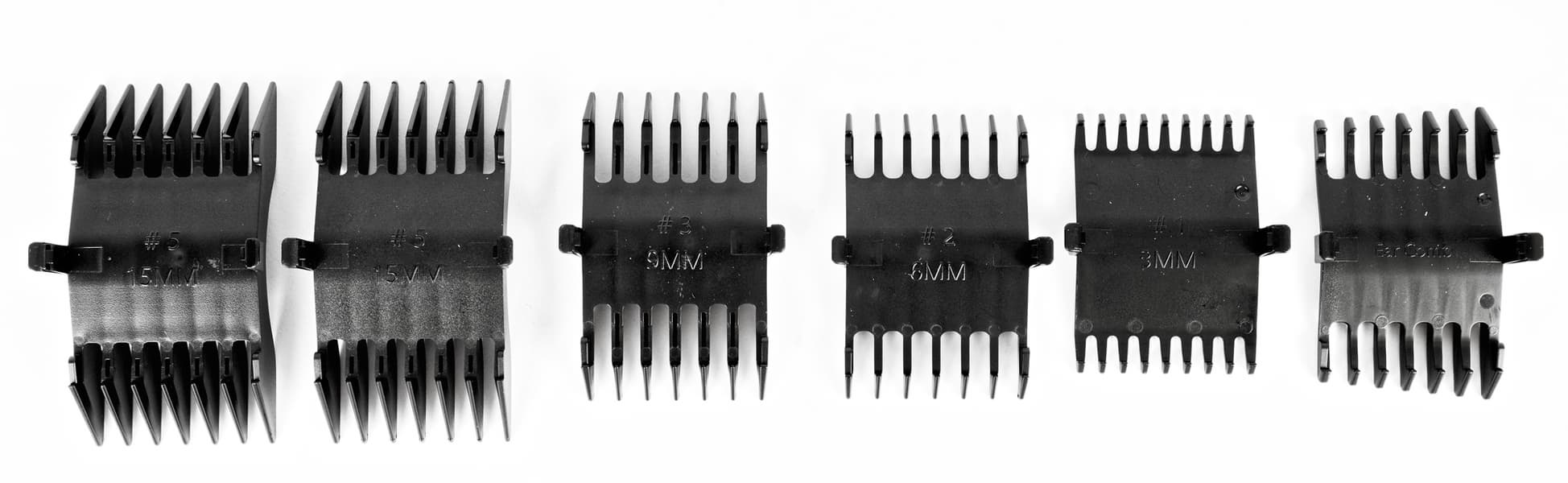В комплекте с триммером производитель положил шесть гребней, соответствующих длине волос 3, 6, 9, 12 или 15 мм. В нашей коробке не обнаружилось гребня на 12 мм, зато производитель положил сразу два гребня на 15 мм.
