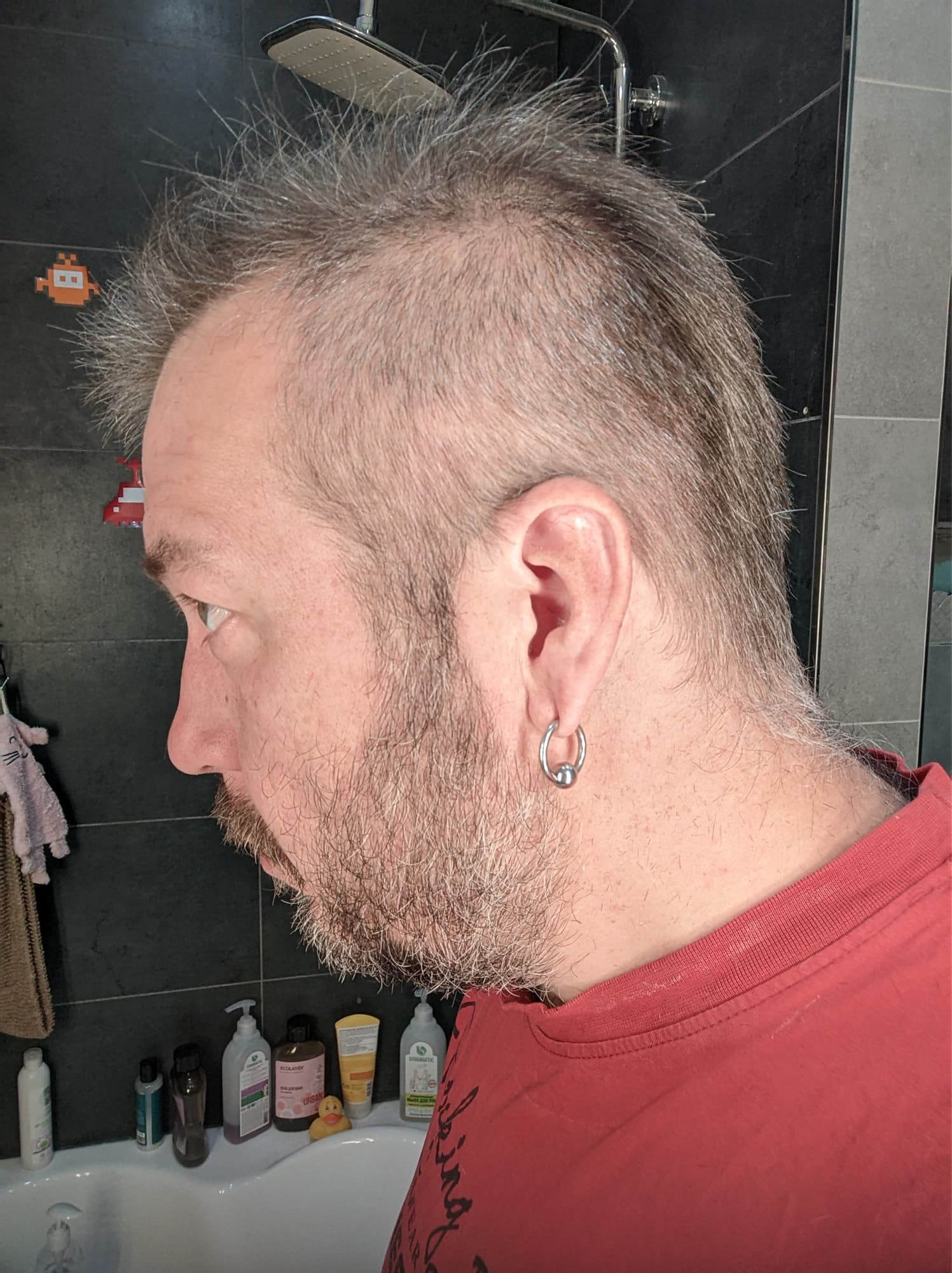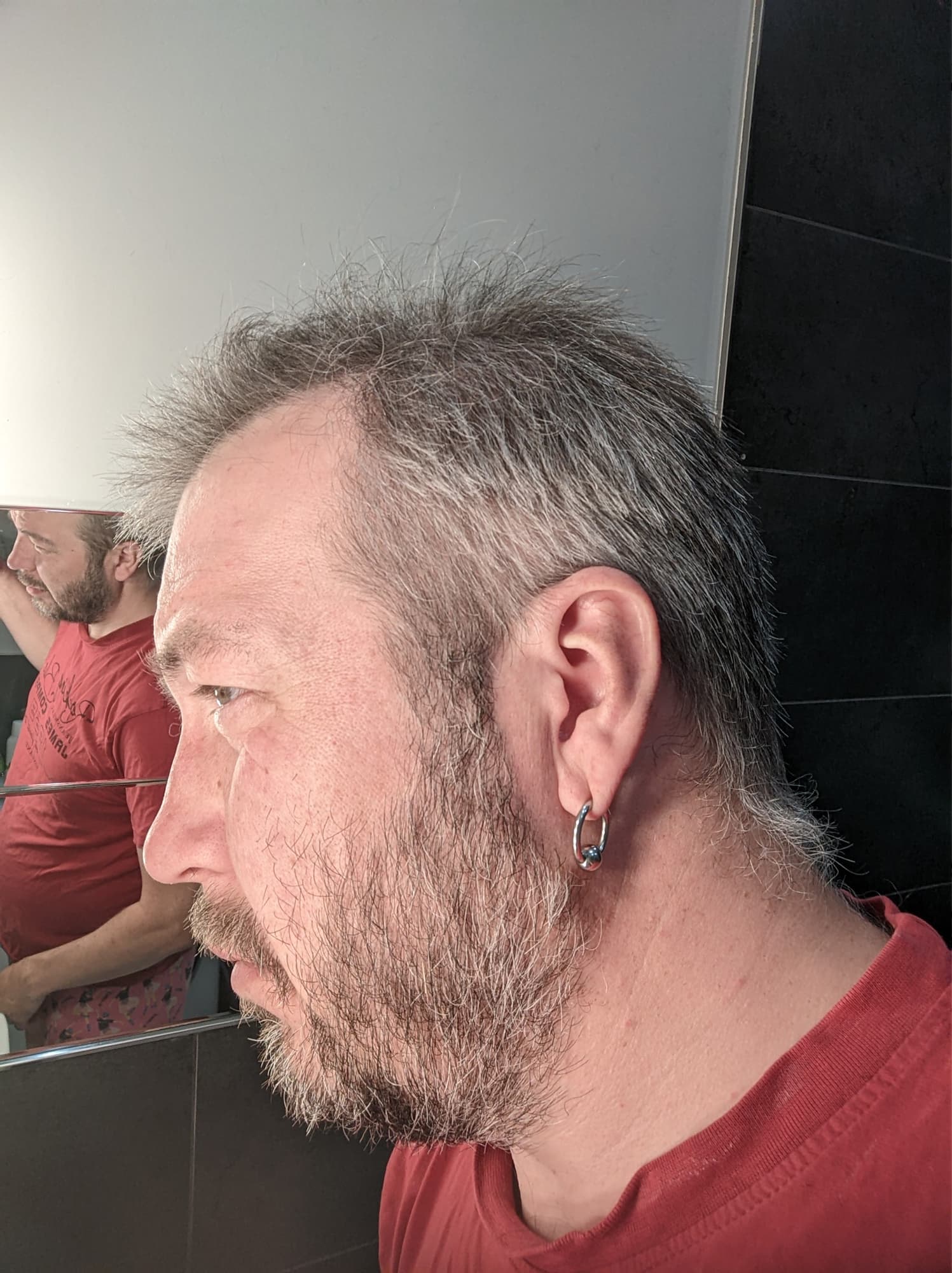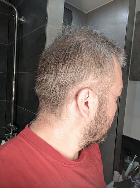 Получилось довольно аккуратно. Осталось «отловить» отдельные волоски. Плавного перехода (как в парикмахерских) с помощью нашей бритвы, конечно, сделать не получится. Поэтому стричься нужно аккуратно, тщательно контролируя процесс.