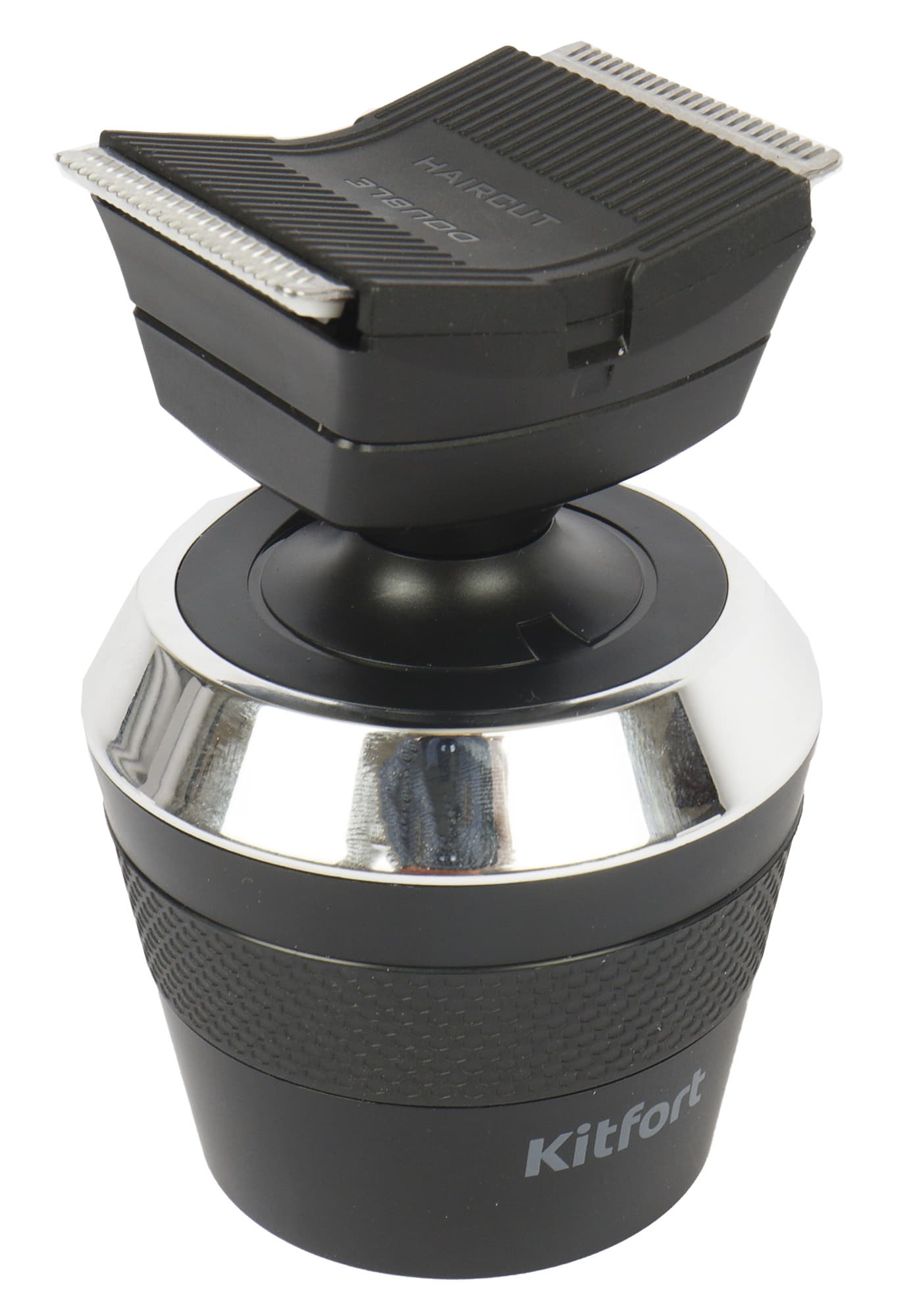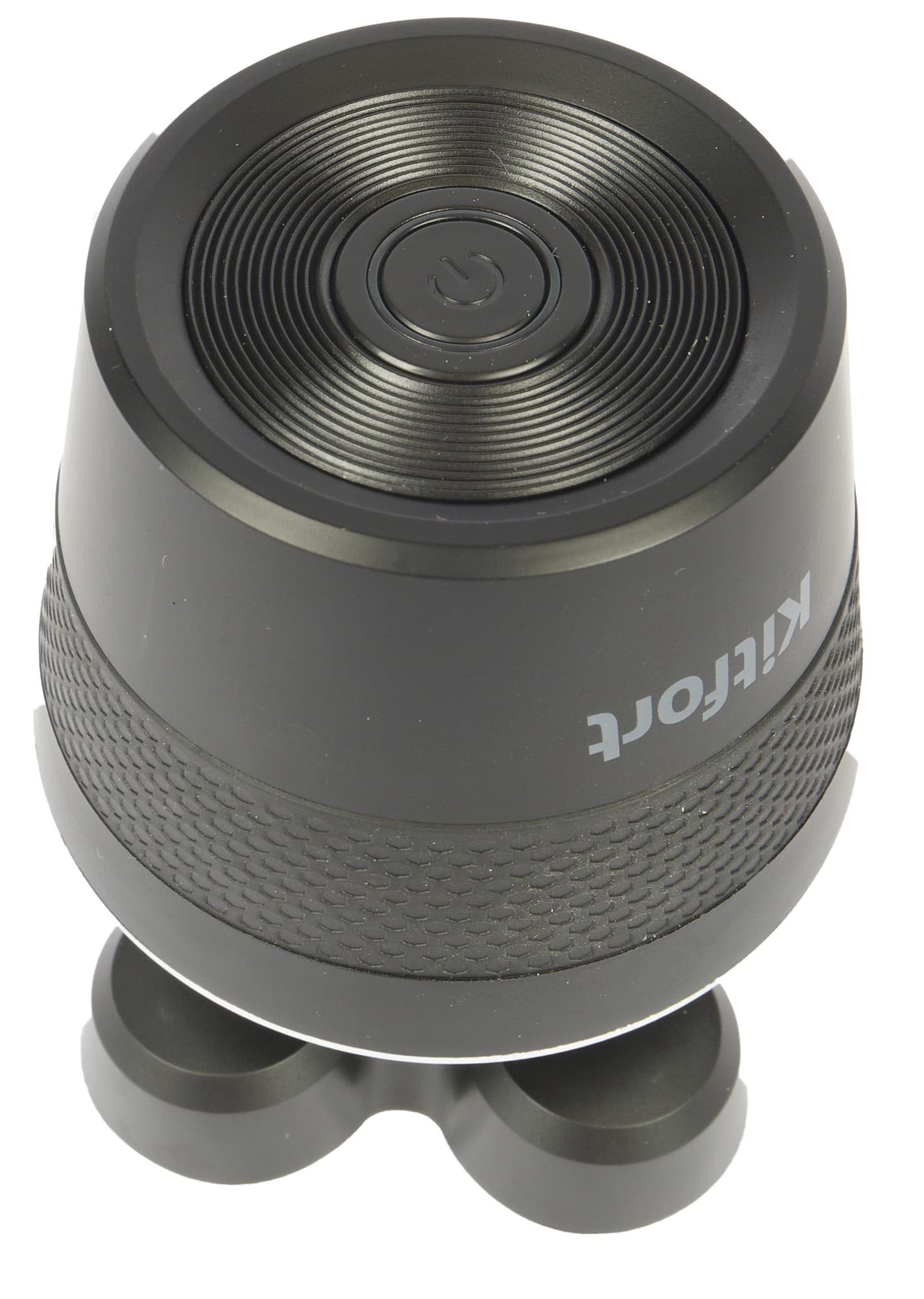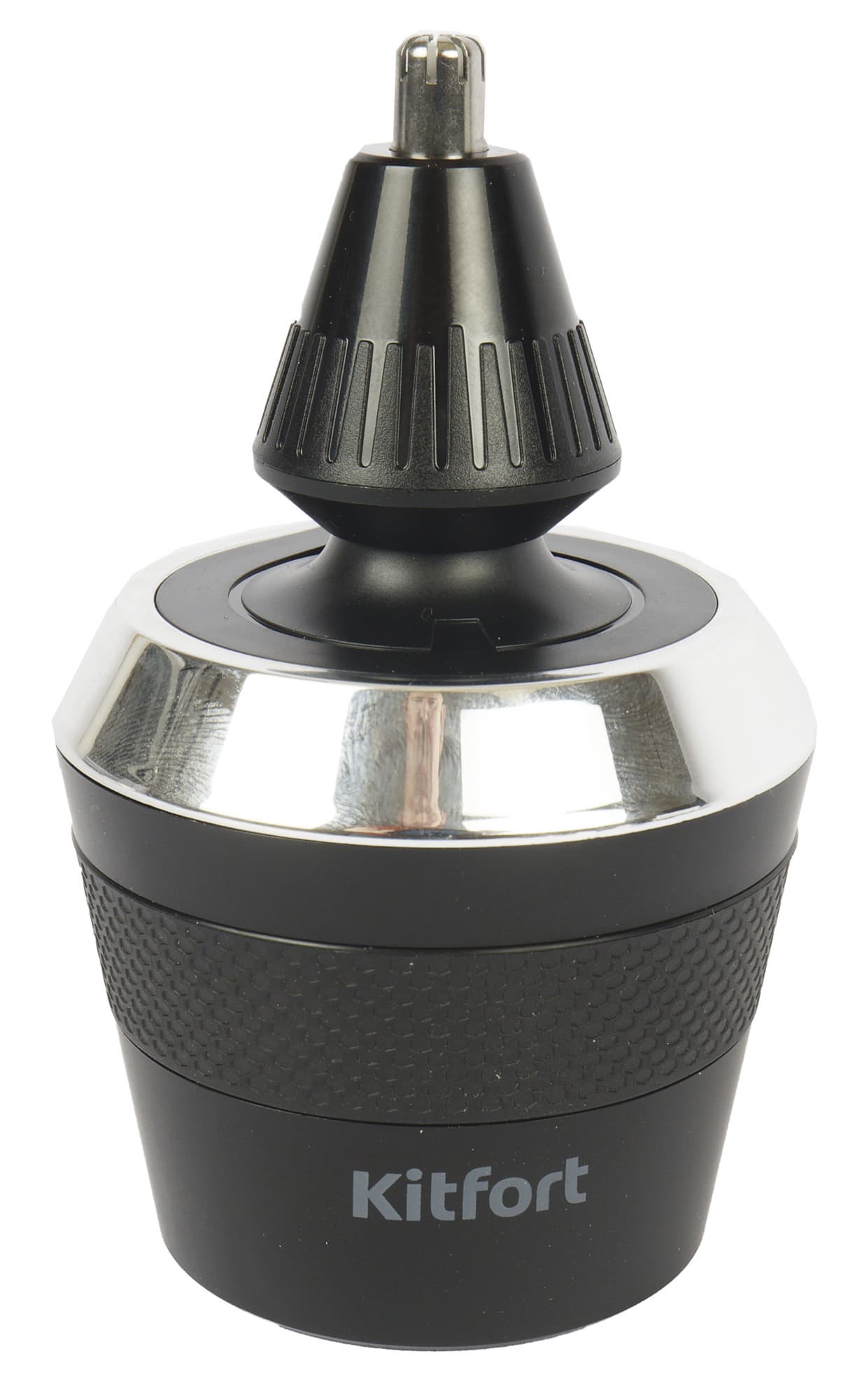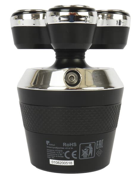У бритвы предусмотрена специальная резиновая зона захвата. Она выглядит как кольцо, опоясывающее «бочонок». Спереди мы видим логотип Kitfort.