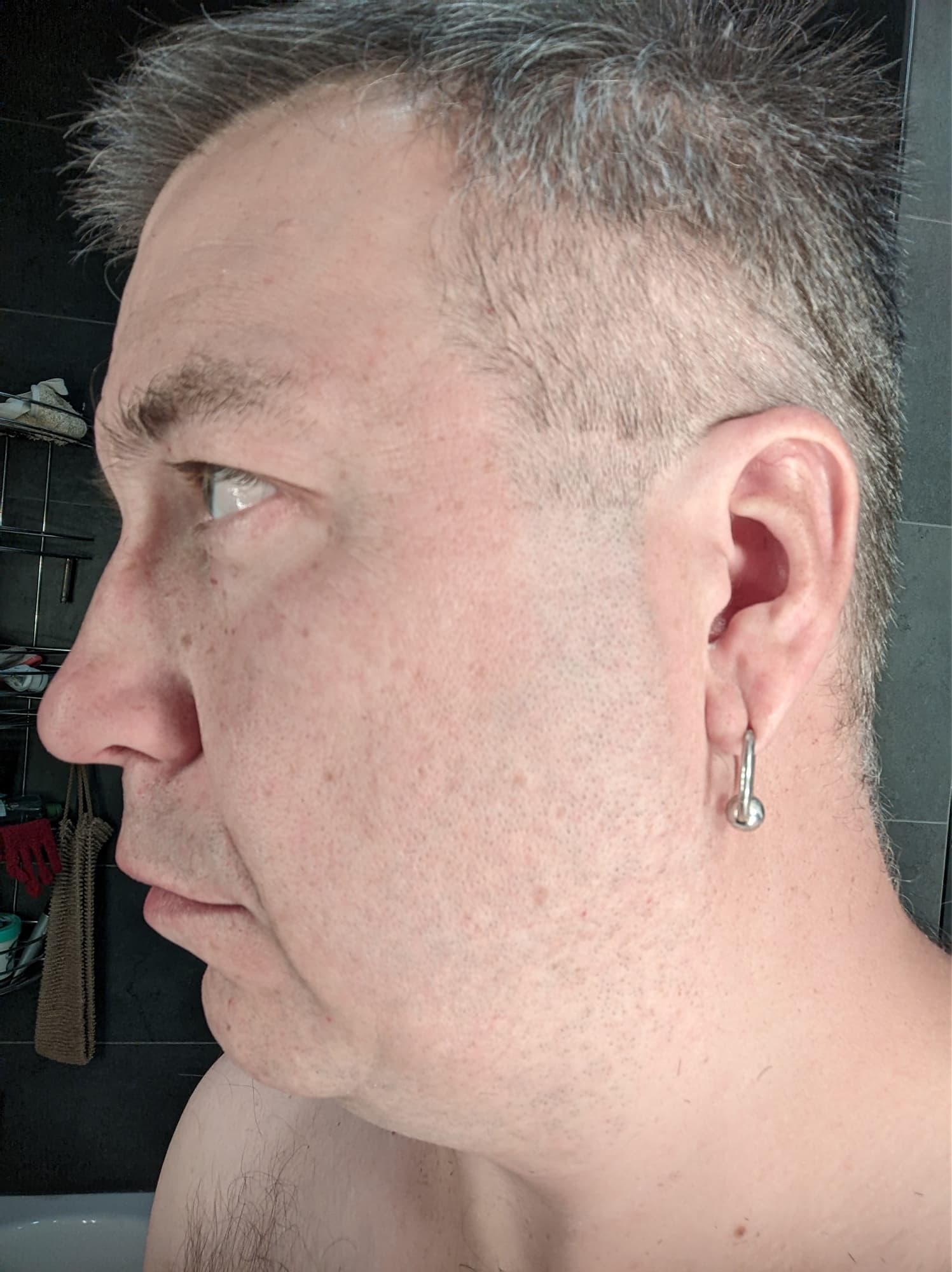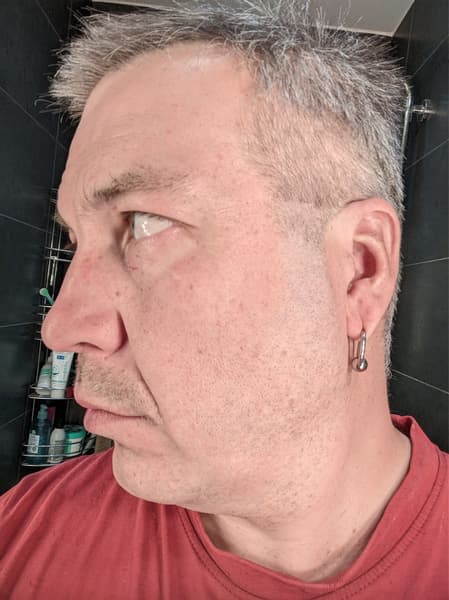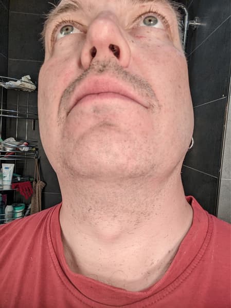 У нас нашлось еще несколько фото, по которым можно оценить качество бритья. По ним видно, что зона шеи требует повышенного внимания: там очень легко упустить слишком длинные волоски.