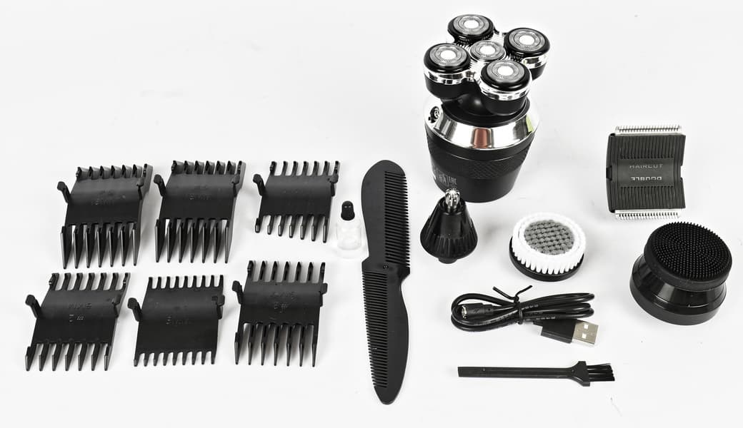 Как мы видим, комплектация у бритвы недвусмысленно намекает на то, что с помощью данного устройства можно и бриться, и стричься, и массажный кабинет дома организовать. Всякого добра в коробке много, поначалу прямо глаза разбегаются.
