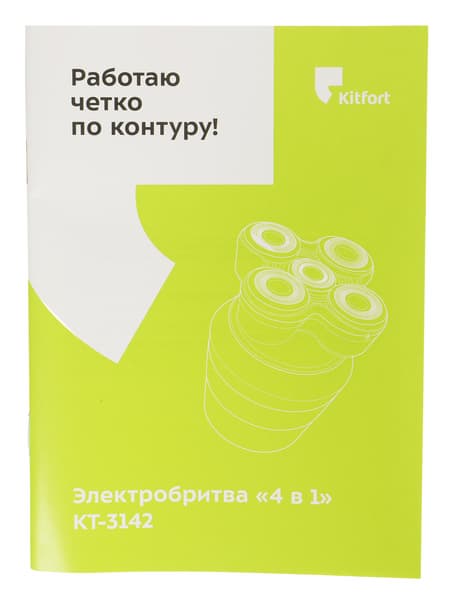 Бритва поставляется в небольшой картонной коробке, оформленной в фирменном стиле Kitfort. Фон у коробки зеленый, дополнительный цвет — фиолетовый. На коробке мы найдем векторное изображение бритвы, а также описание ее основных технических характеристик и возможностей.