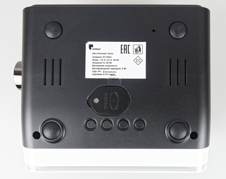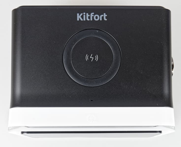 Сверху, как и у других моделей, находится беспроводная зарядка, над ней — логотип Kitfort, а внизу — кнопка «отложить сигнал будильника». Несмотря на то, что кнопка эта выглядит как сенсорная (как у ранее рассмотренных моделей), на этот раз это впечатление ошибочно. На самом деле никакой кнопки тут нет: нажимая на зону «отложить сигнал будильника», мы попросту надавливаем на корпус часов, а сама кнопка прячется... под передними ножками устройства.