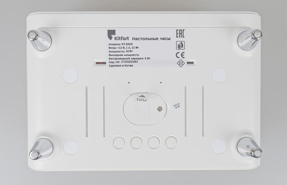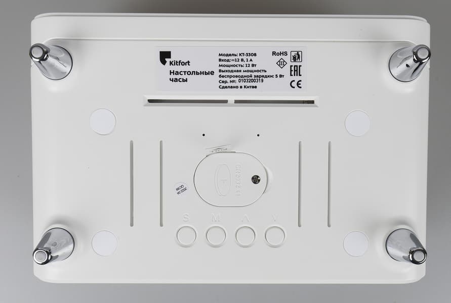 Снизу мы видим наклейку с технической информацией, ниже — место установки батареи CR2032 (пригодится на случай кратковременного отключения электричества), еще ниже — четыре кнопки для всевозможных настроек. У часов имеются резиновые ножки, препятствующие скольжению.