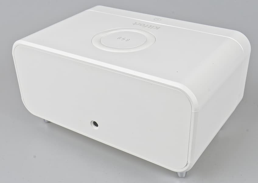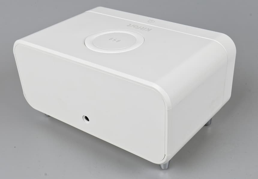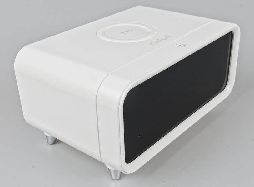 Основной материал, из которого сделаны часы — белый матовый пластик. С лицевой стороны находится дисплей, сверху — беспроводная зарядка, под ней — логотип Kitfort, а еще ниже — сенсорная кнопка «отложить сигнал будильника».